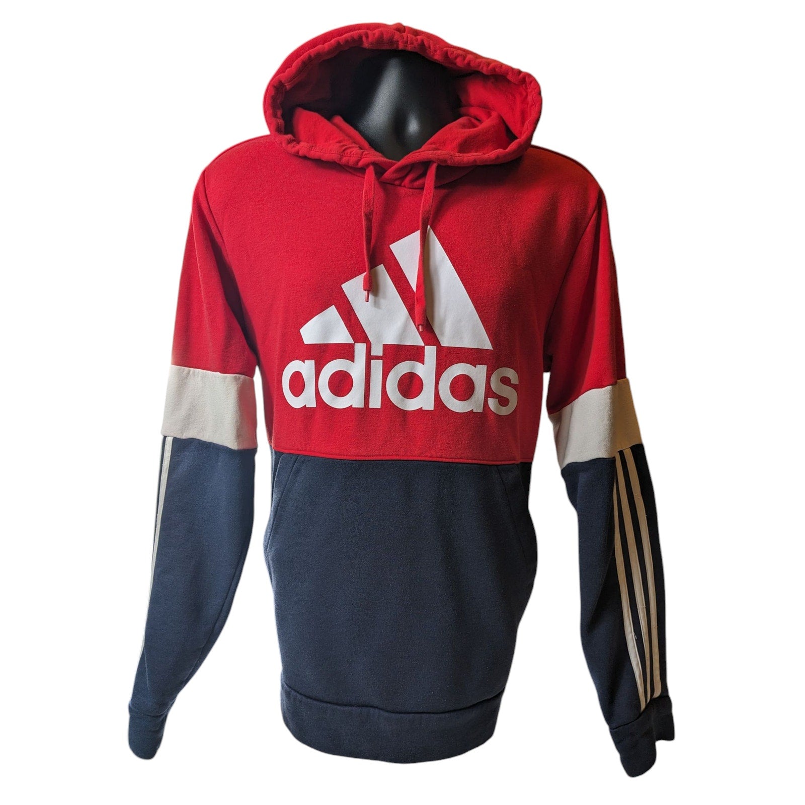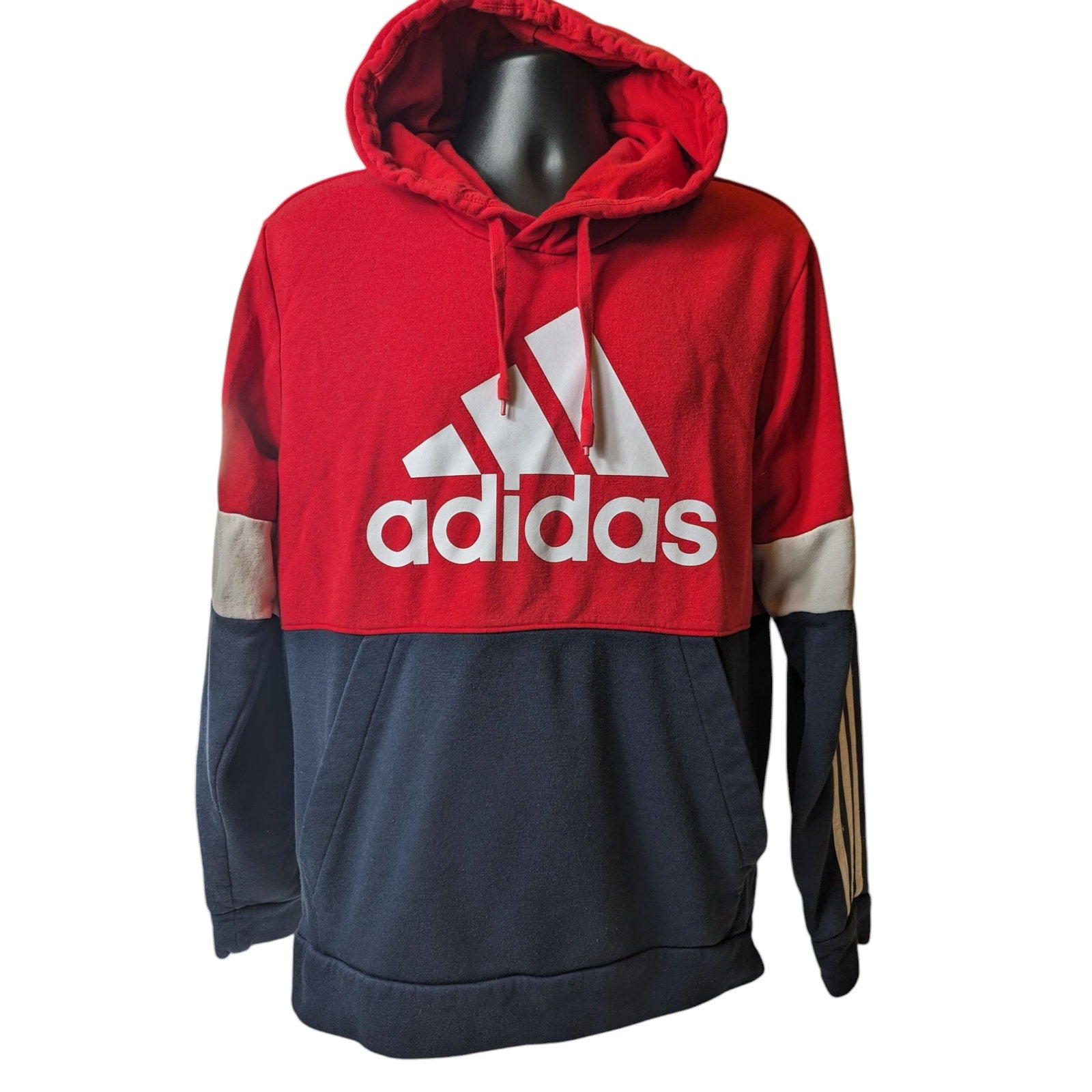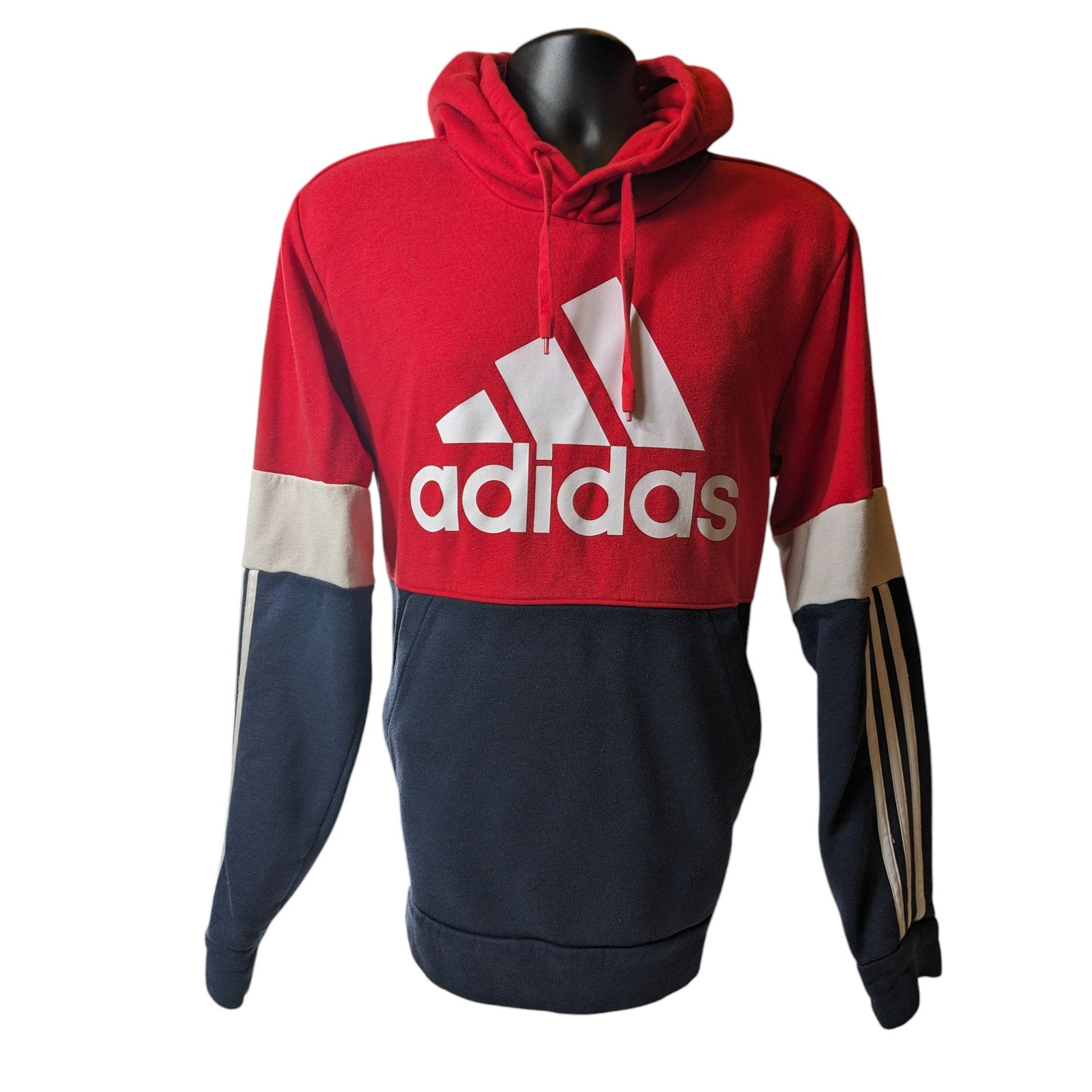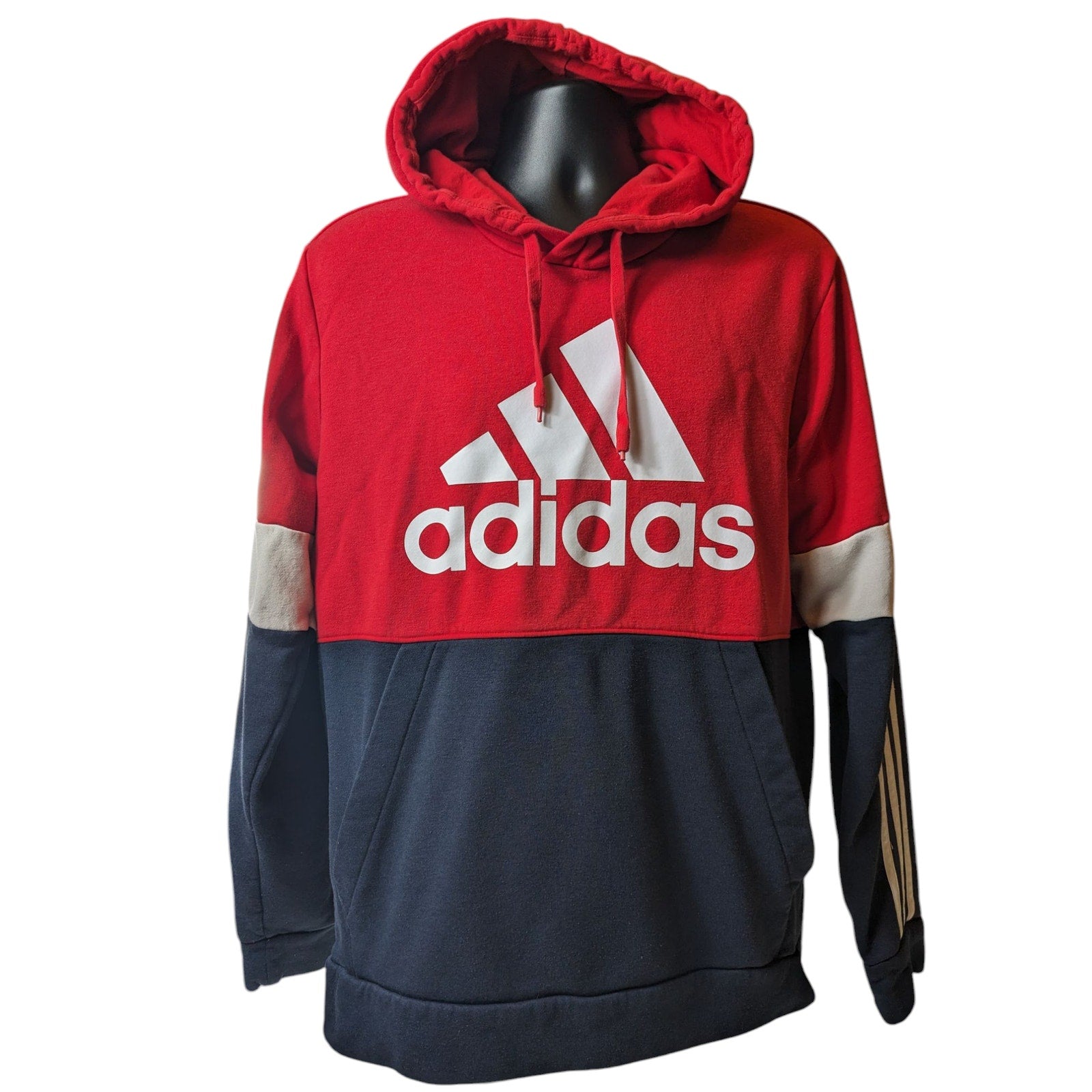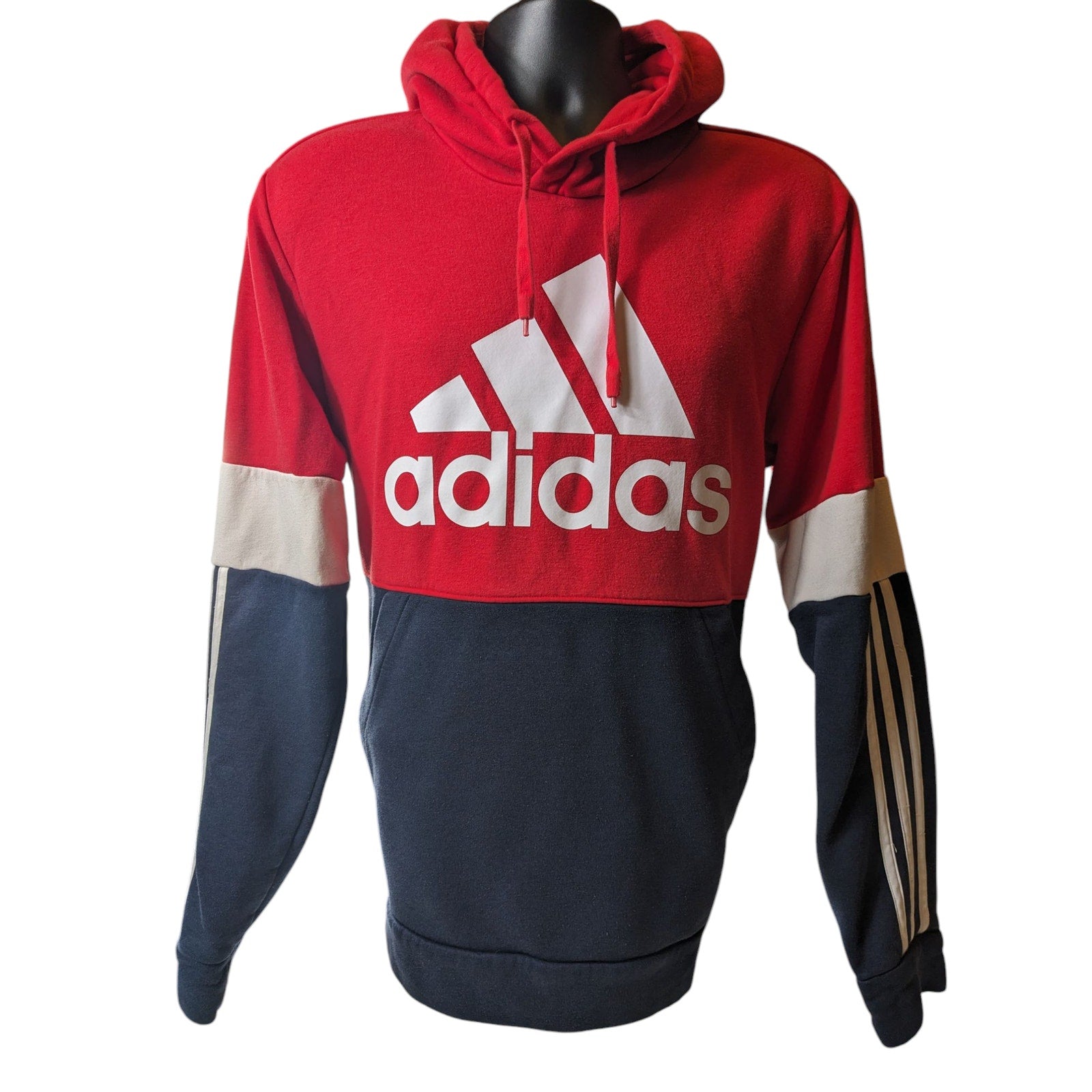Adidas Hoodie Mens Medium-Large Red Navy Colorblock Pullover Sweatshirt Logo Streetwear Drawstring Kangaroo Pocket