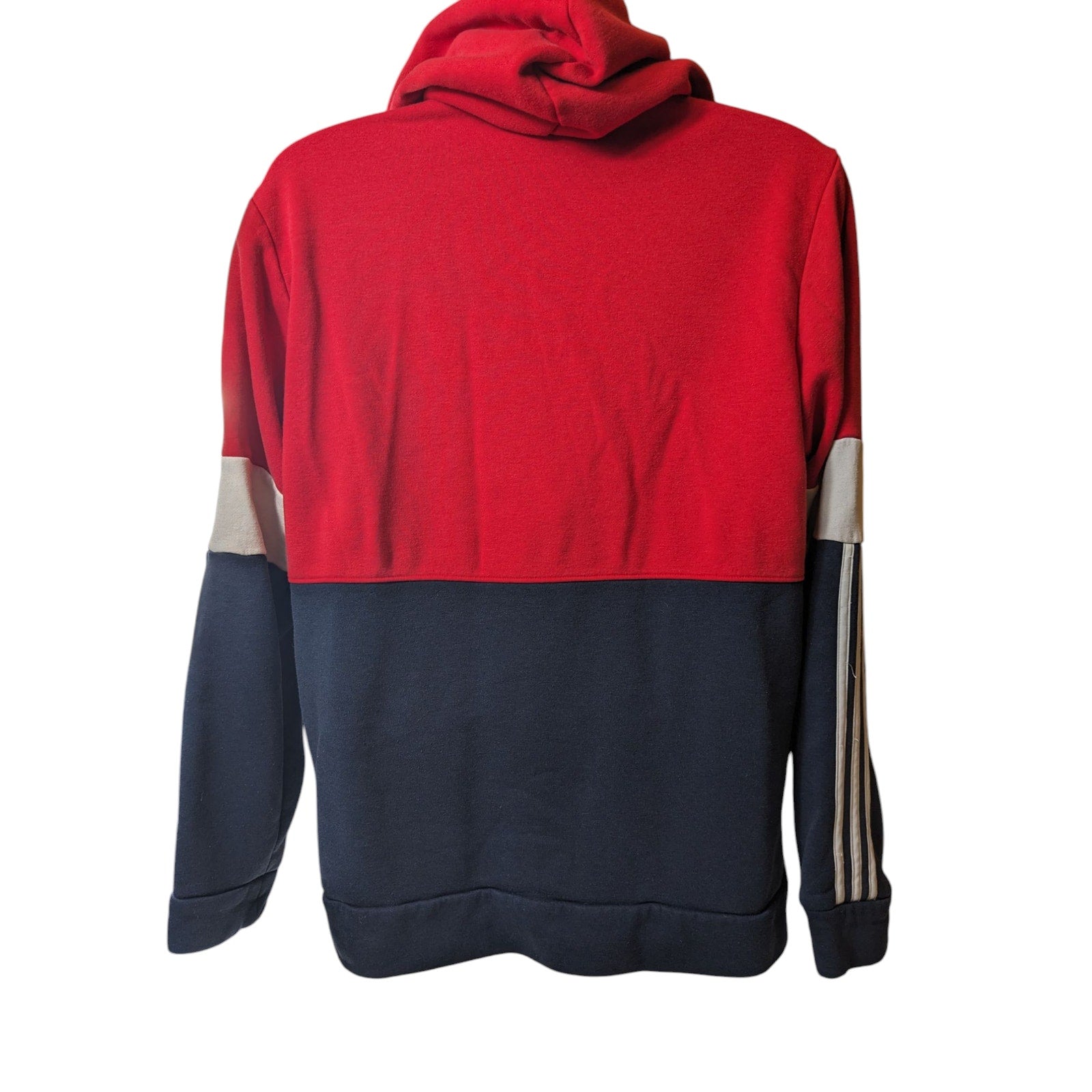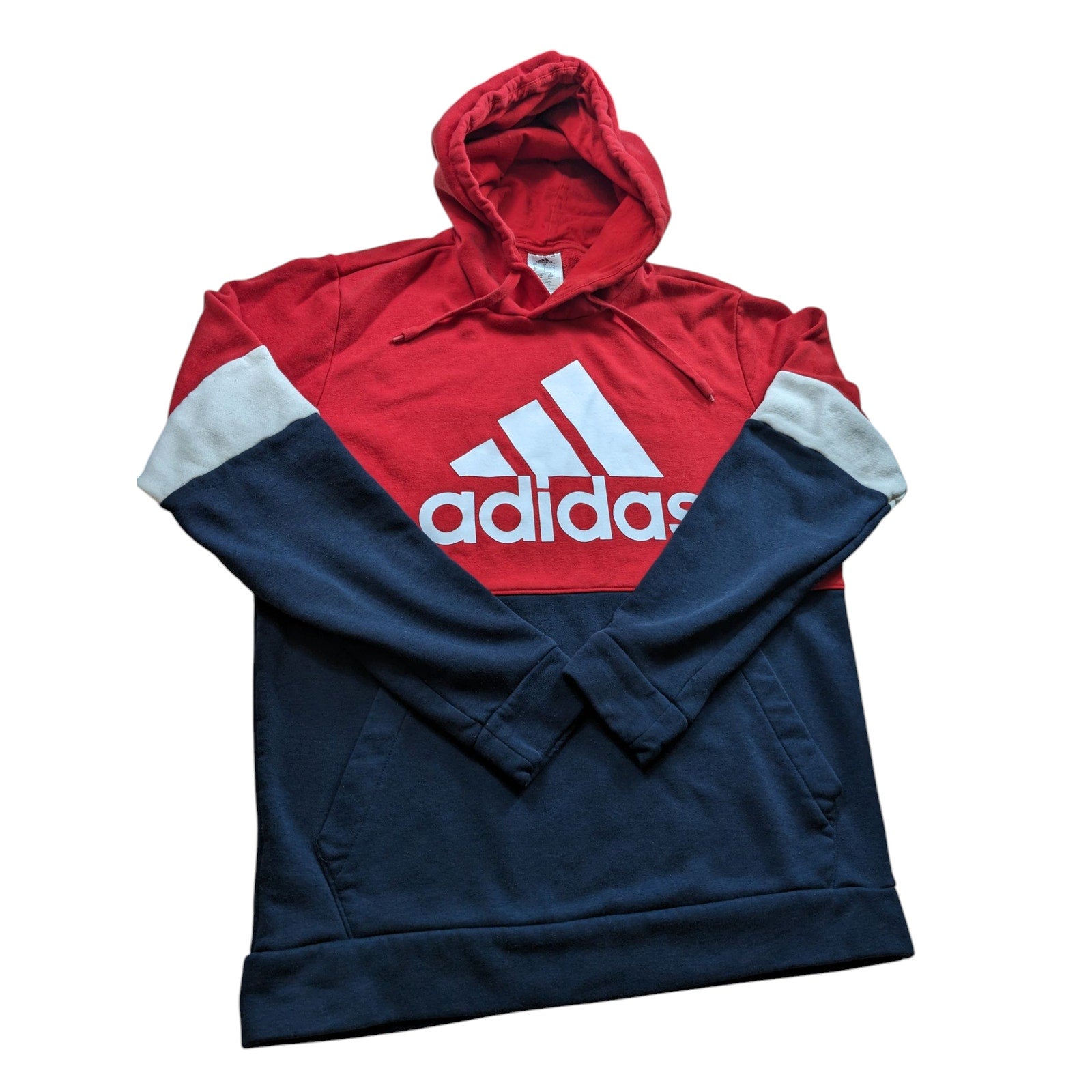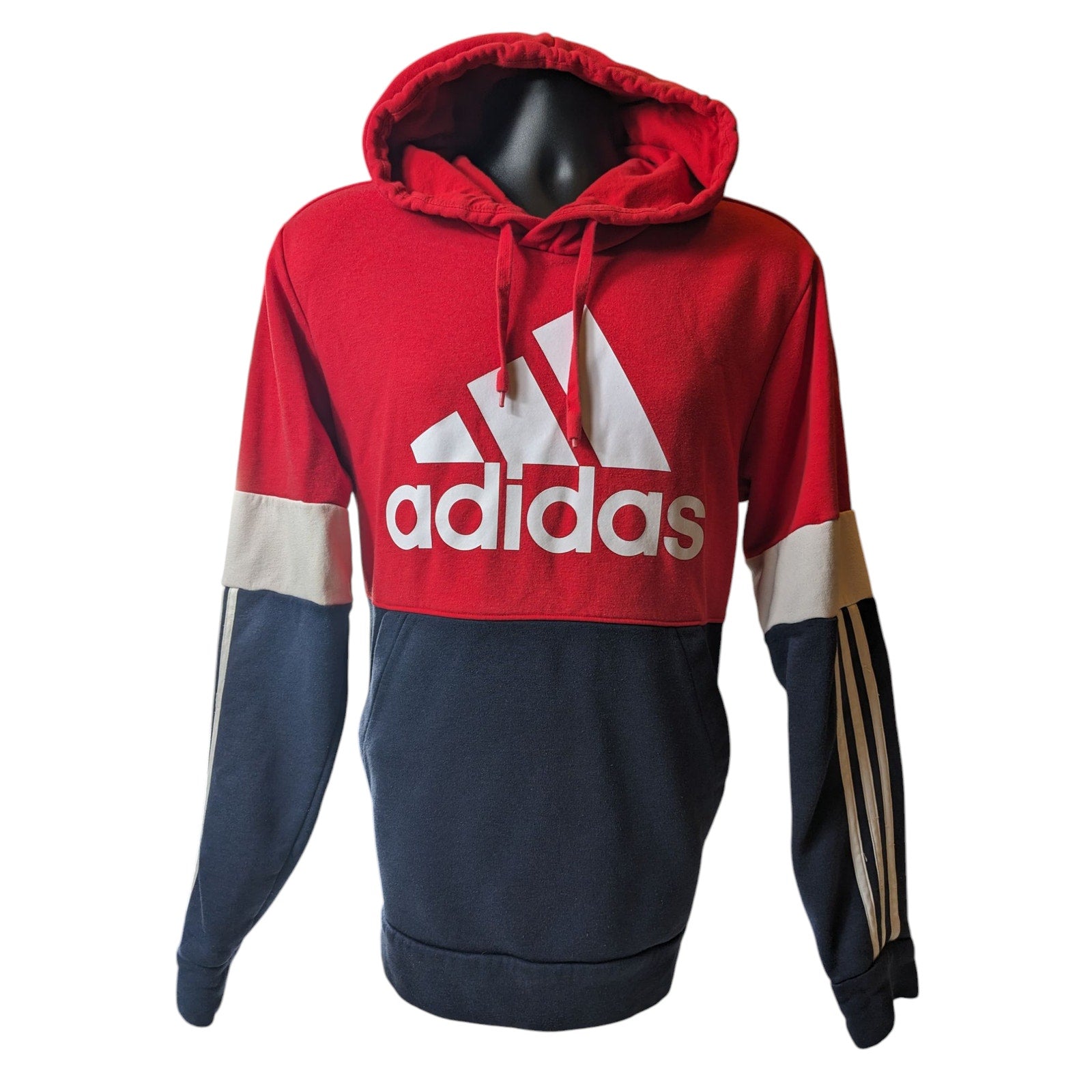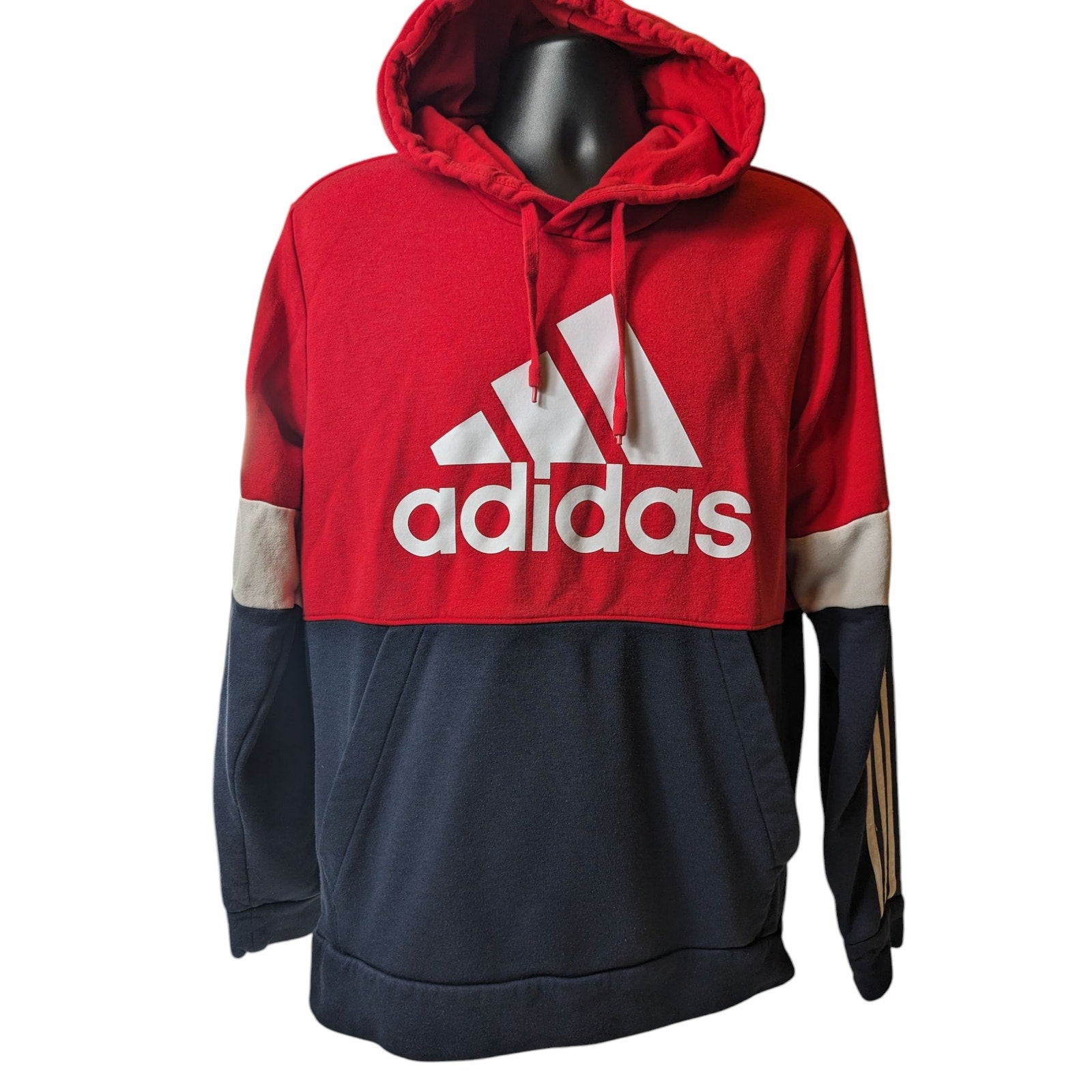 Adidas Hoodie Mens Medium-Large Red Navy Colorblock Pullover Sweatshirt Logo Streetwear Drawstring Kangaroo Pocket