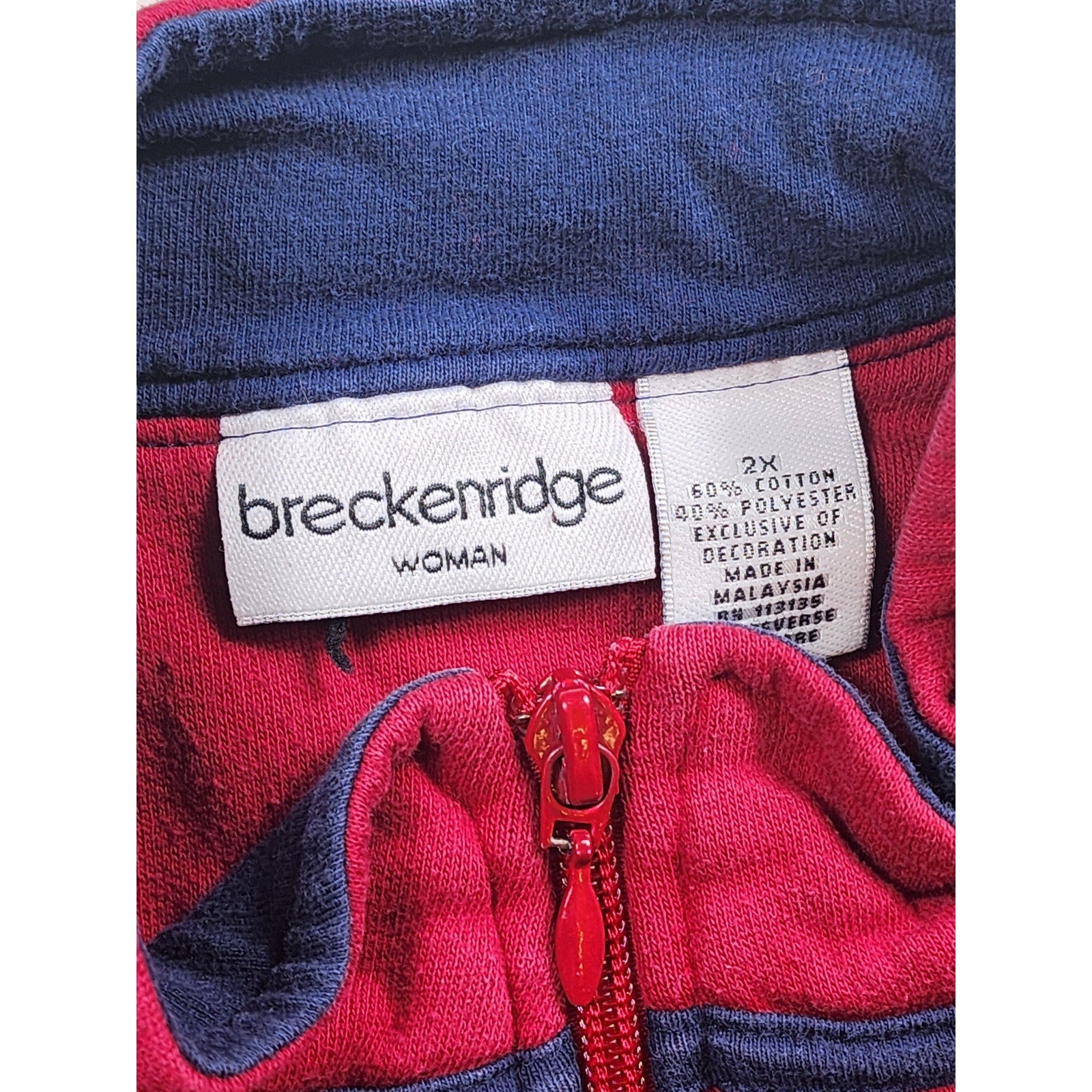 Breckenridge women's 1/4 zip pullover sweatshirt in size 2X. Featuring a red color with navy accents and a charming embroidered bird design on the front. Made of a soft cotton-polyester blend for comfort and durability. Perfect for casual wear, cozy lounging, or layering during colder seasons.