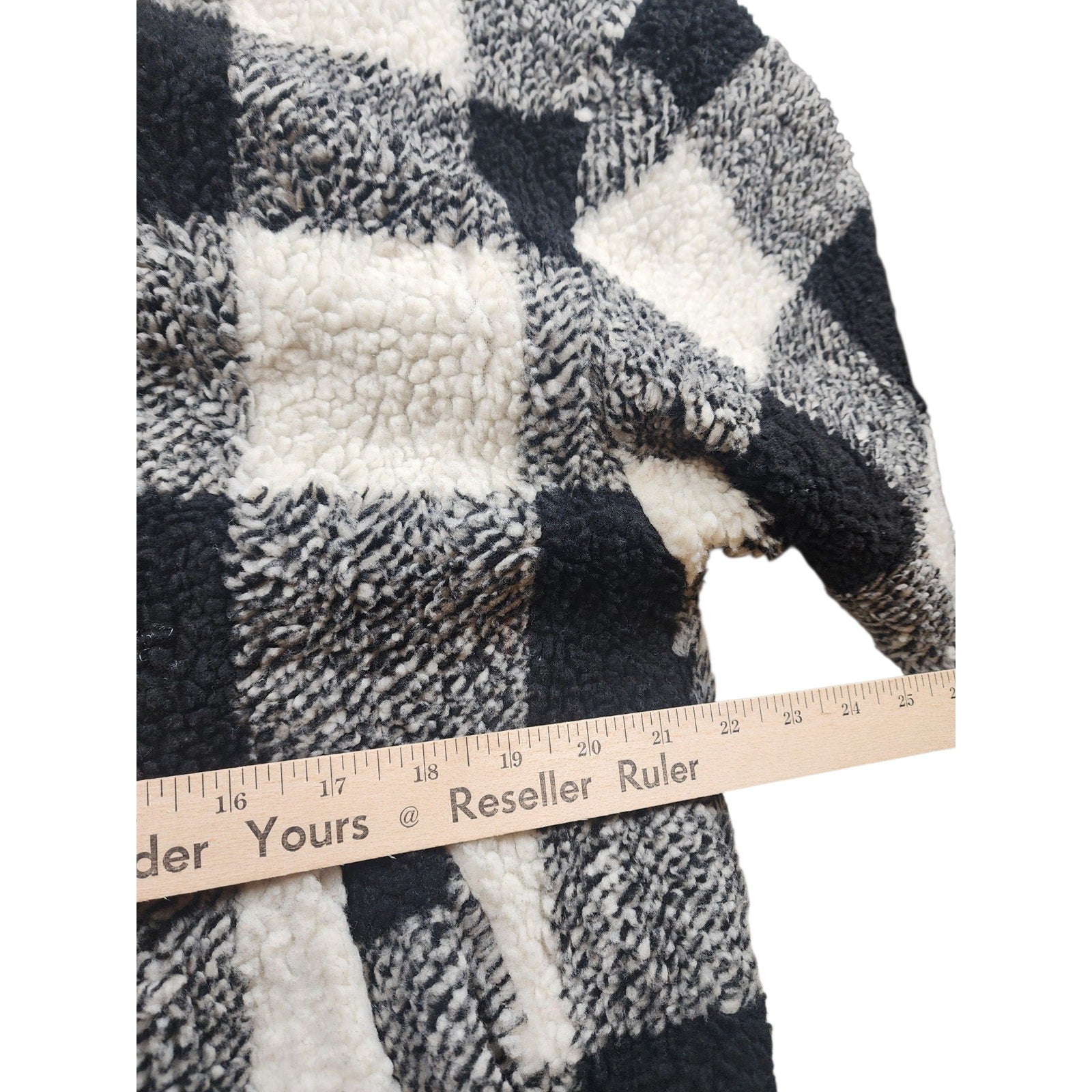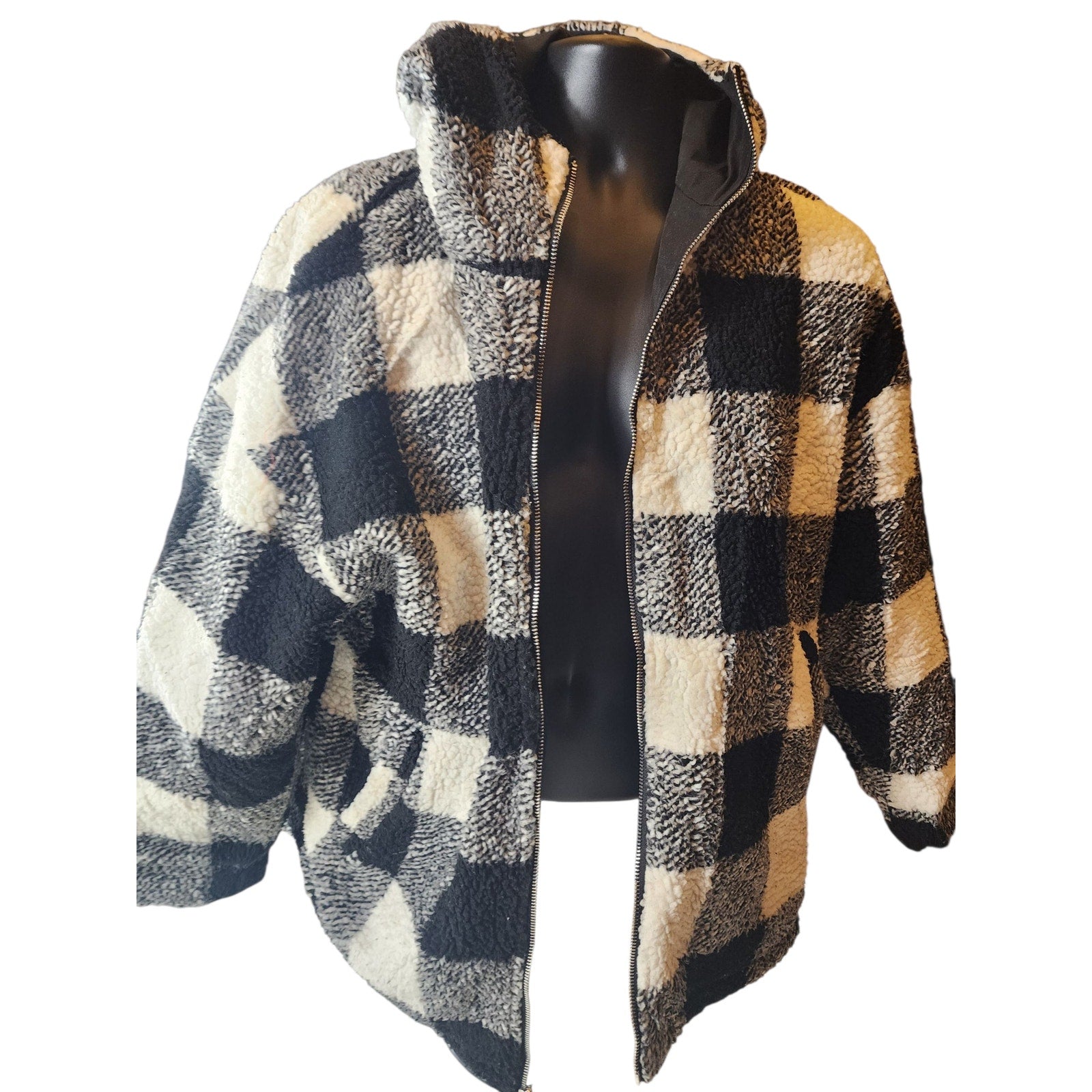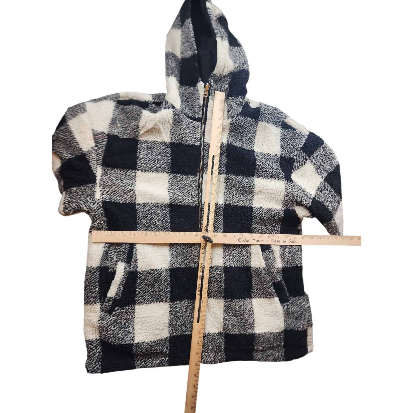 Buffalo Check Sherpa Fleece Jacket Large Black White Plaid Zip Hooded Coat Cozy