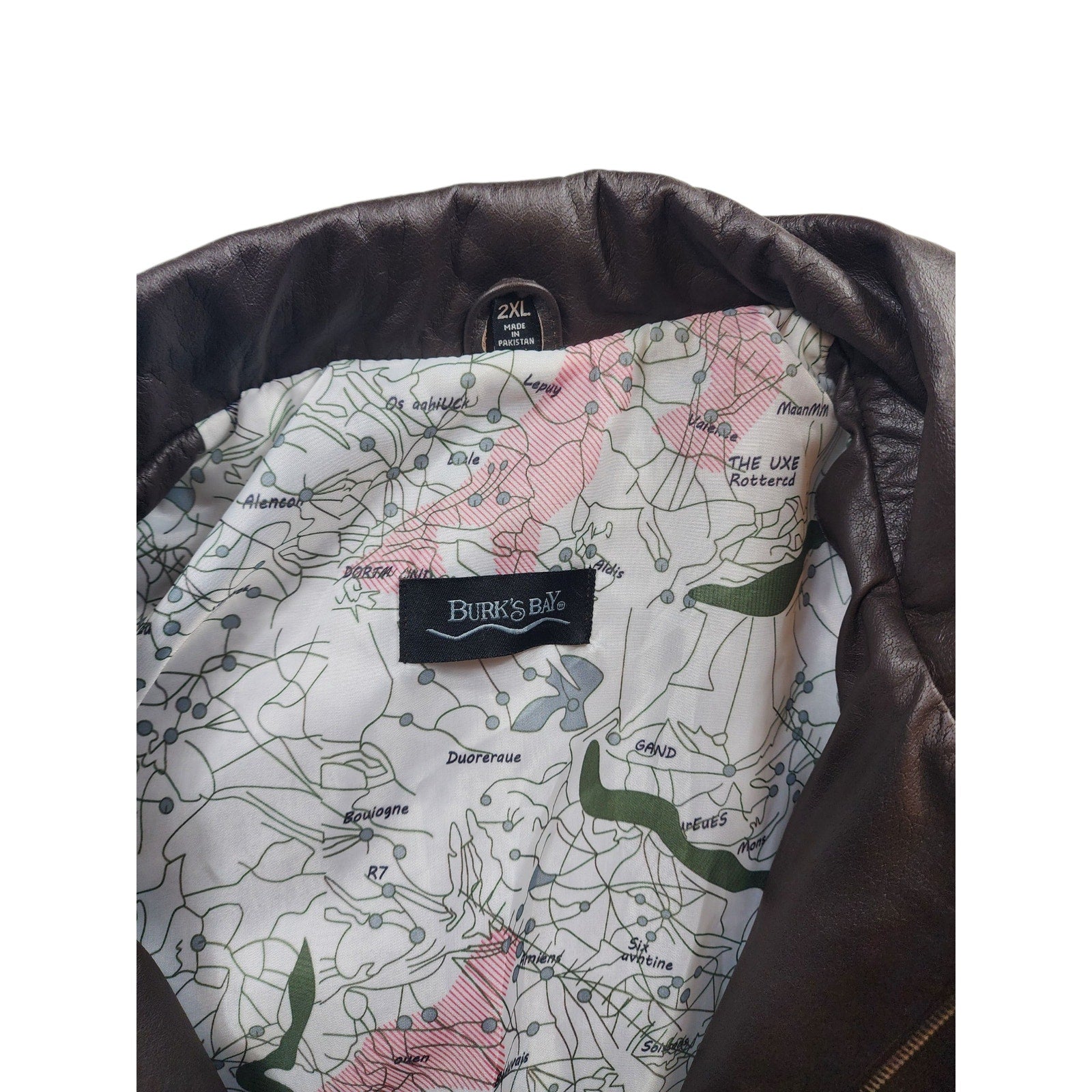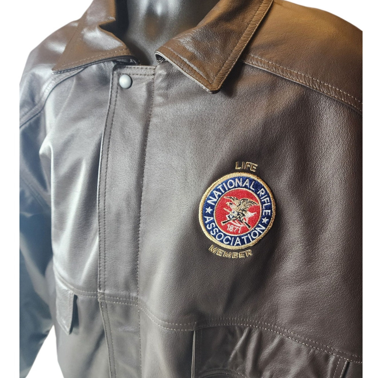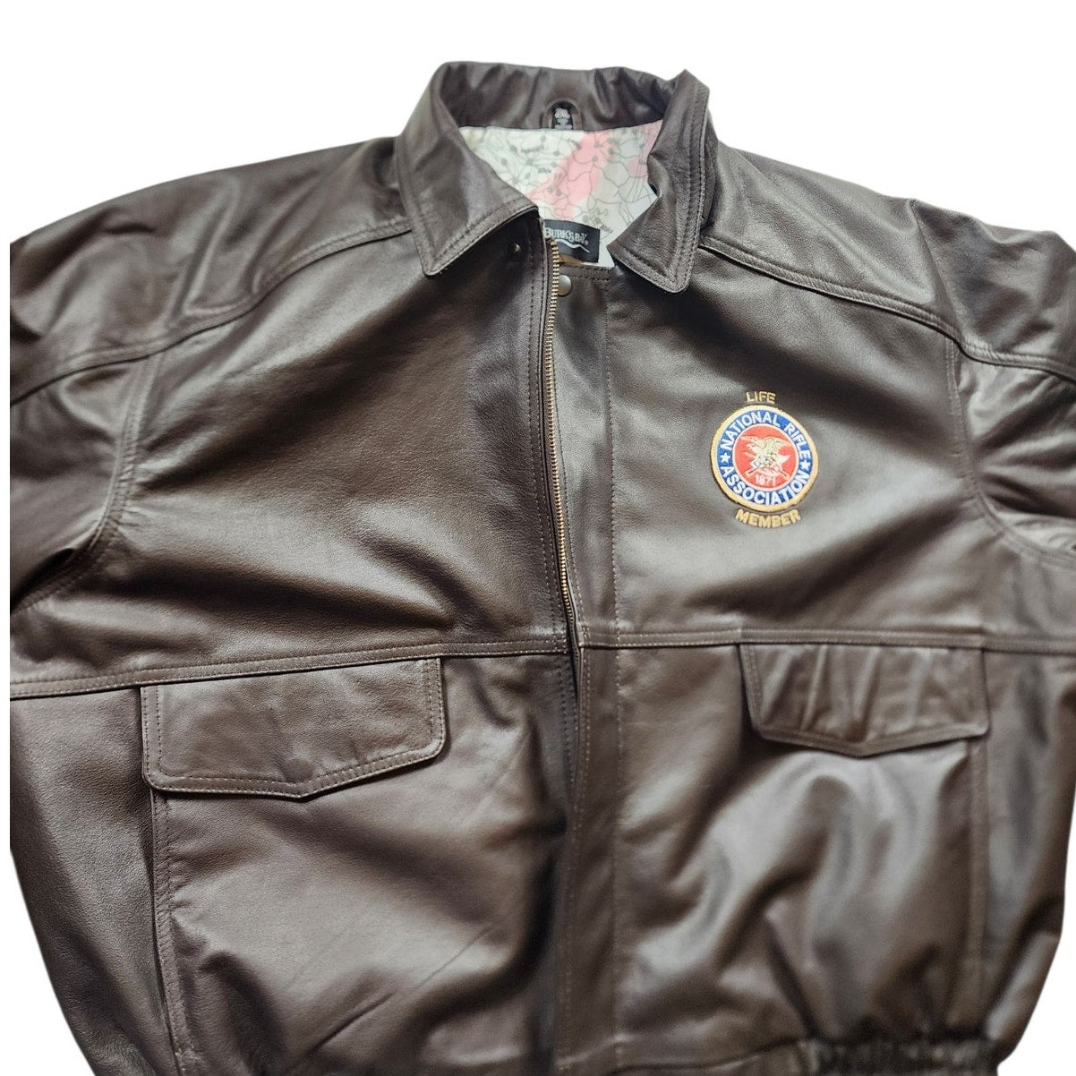 Burks Bay Leather Jacket Mens 2XL NRA Life Member Patch Logo Brown Bomber Collectible Americana Motorcycle Biker Vintage Y2K