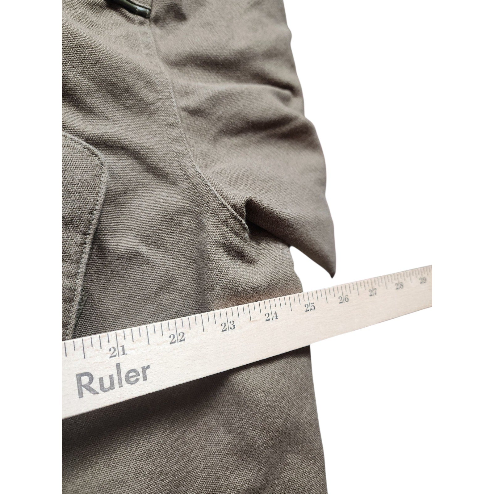 Features: Corduroy collar, interior drawstring waist, snap front with storm flap, utility pockets