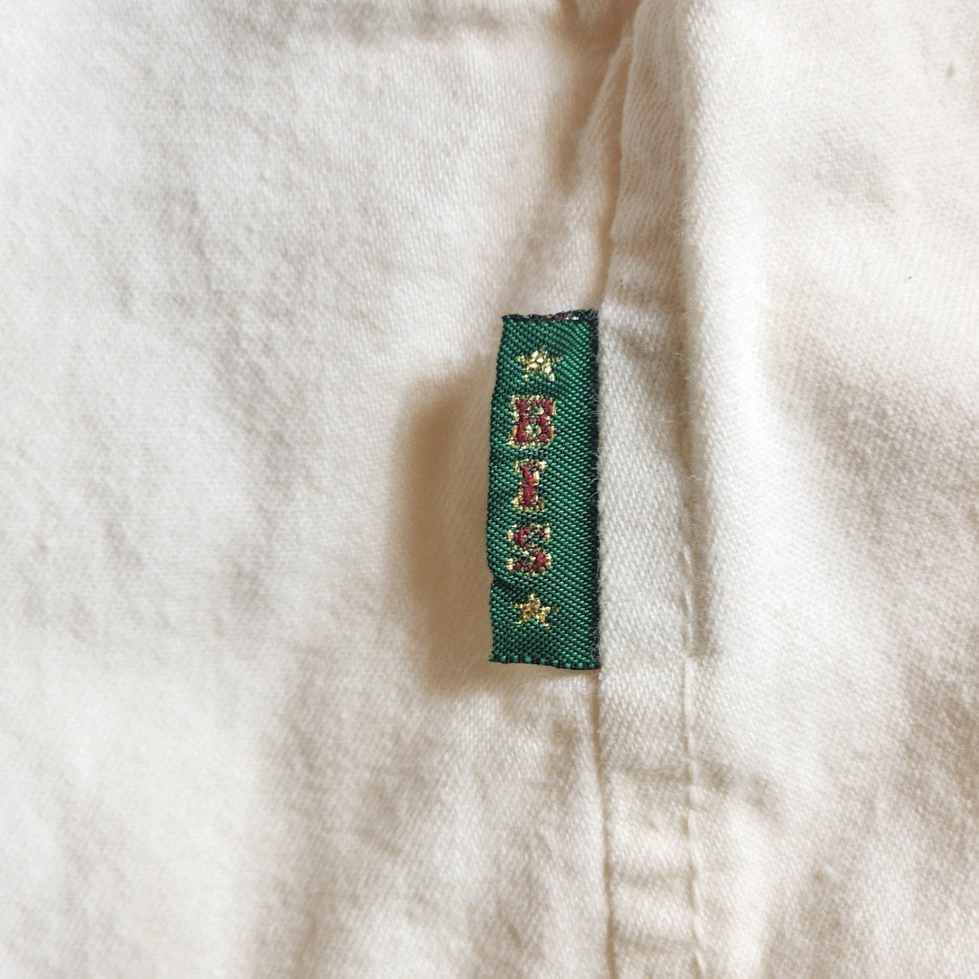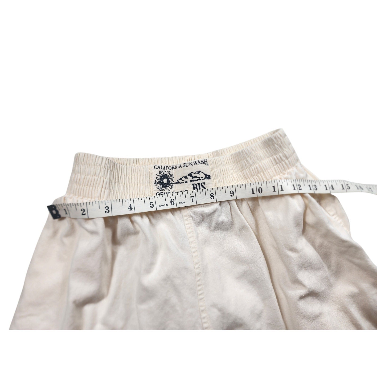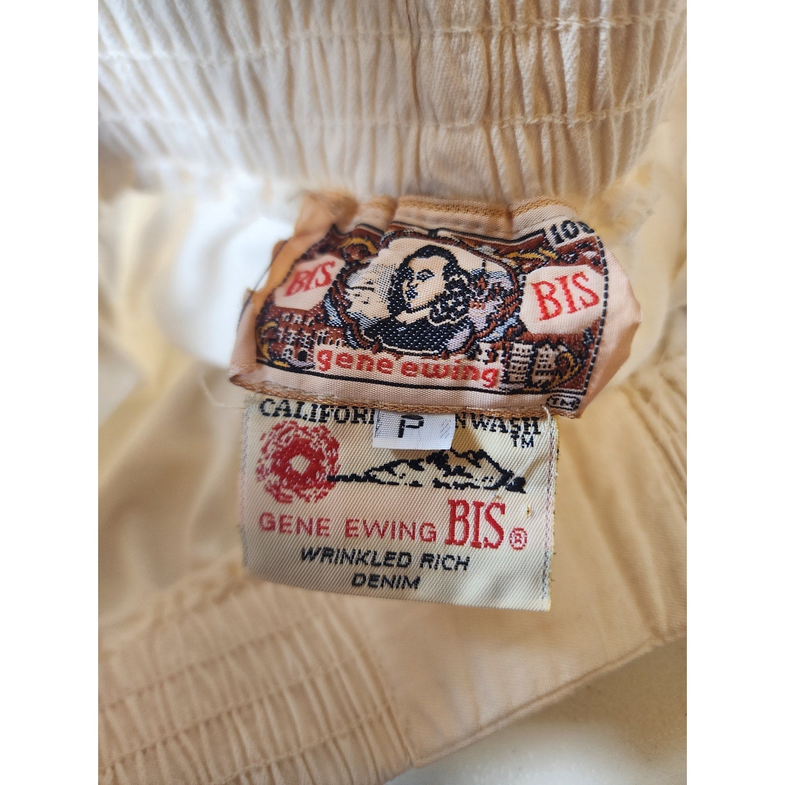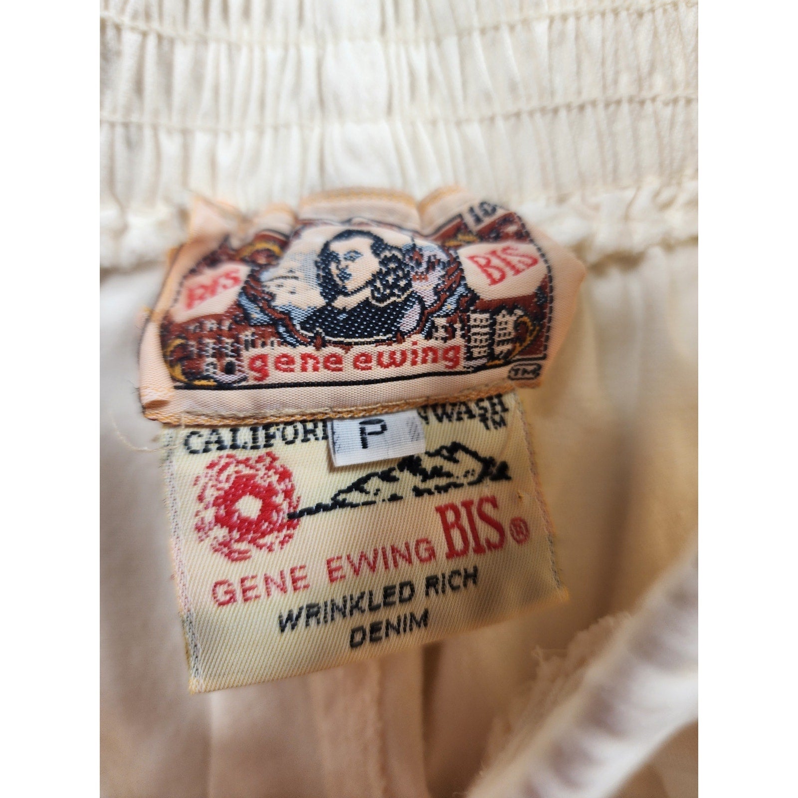 Authentic vintage Gene Ewing BIS “Wrinkled Rich Denim” shorts made in the USA. Features soft 100% cotton fabric, an elastic waistband for comfort, and an off-white, sunwashed look. A rare California Sunwash piece with unique vintage charm and collectible appeal.