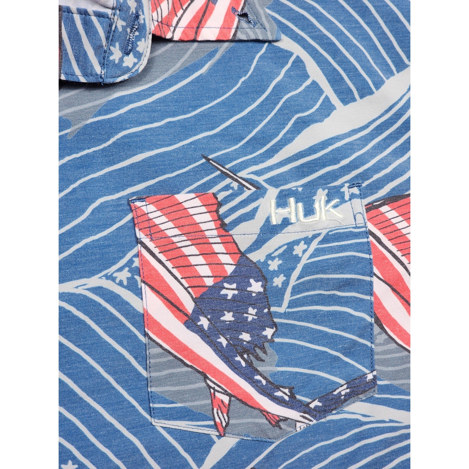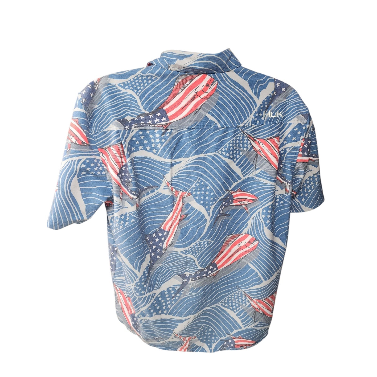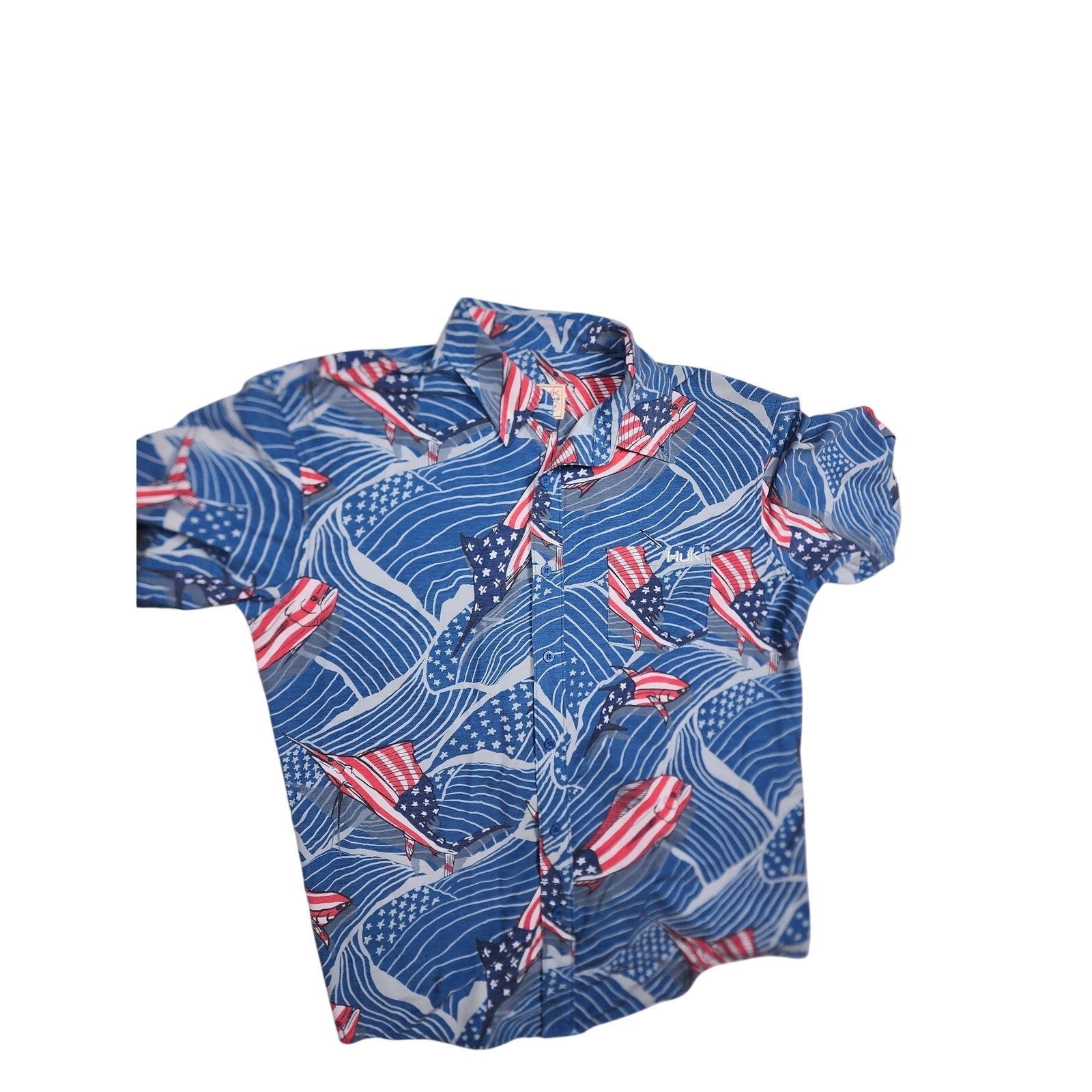 Huk Fishing Shirt Mens Medium Patriotic Red White Blue Marlin Button Down Short Sleeve Performance Outdoor Casual Top 4th July Boating Americana Flags