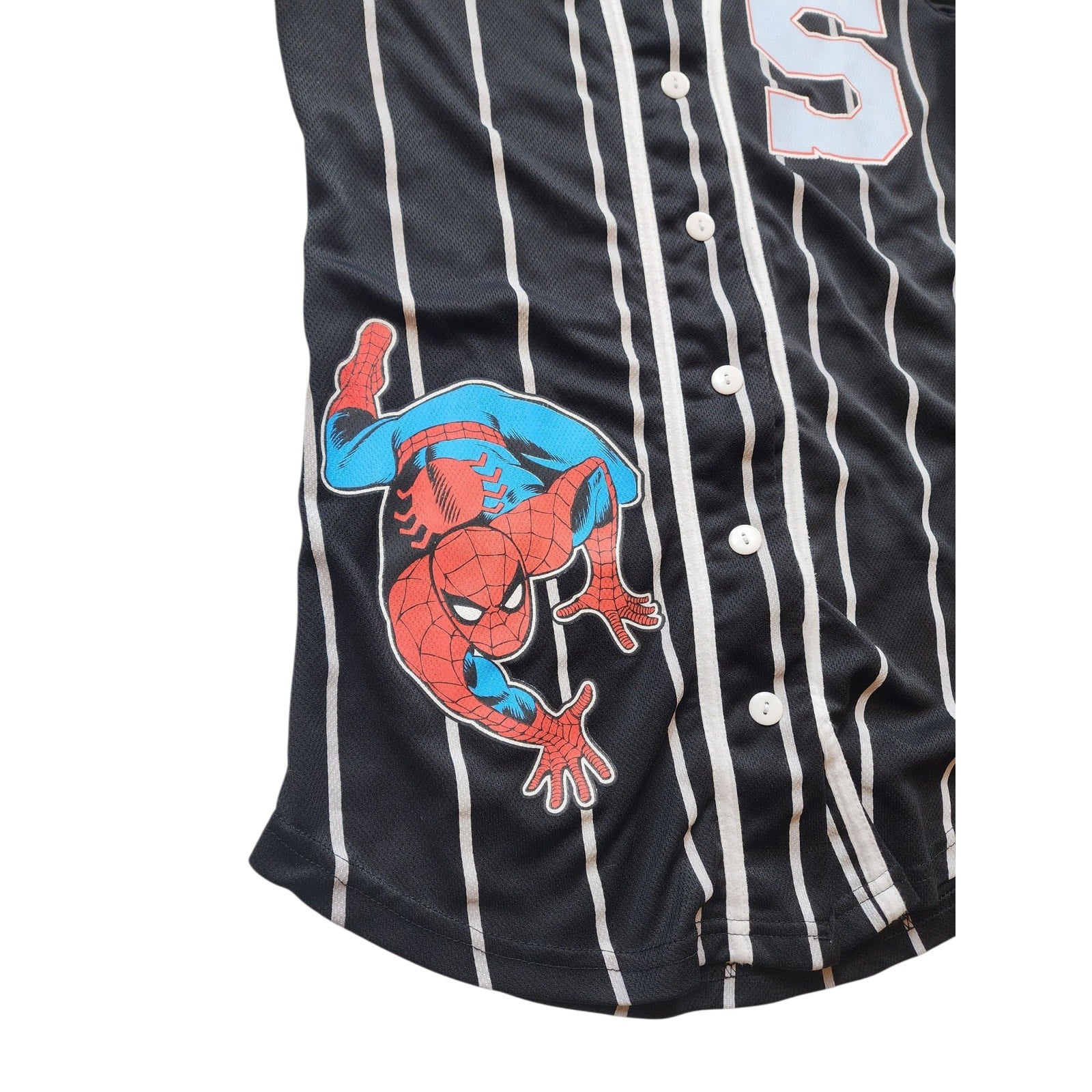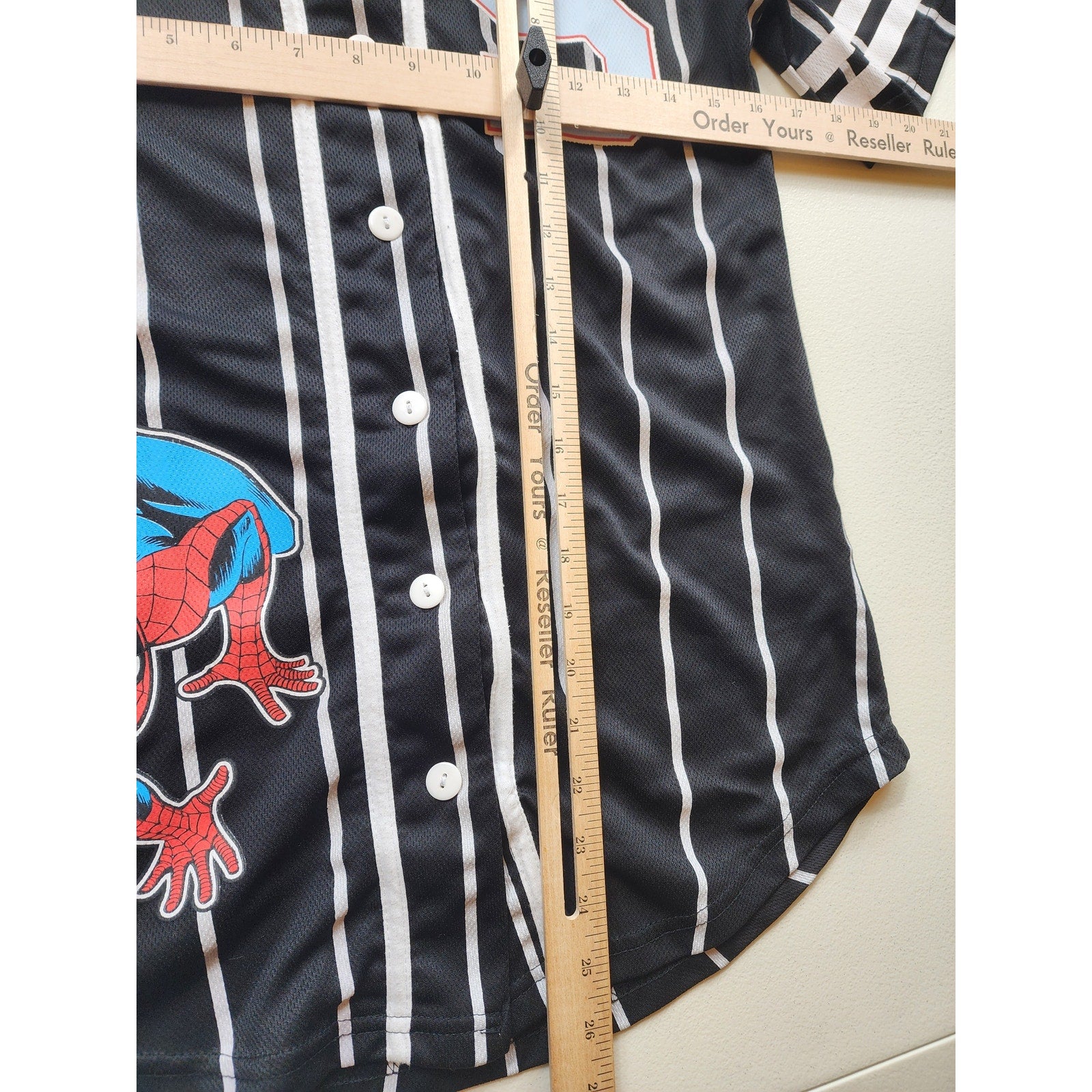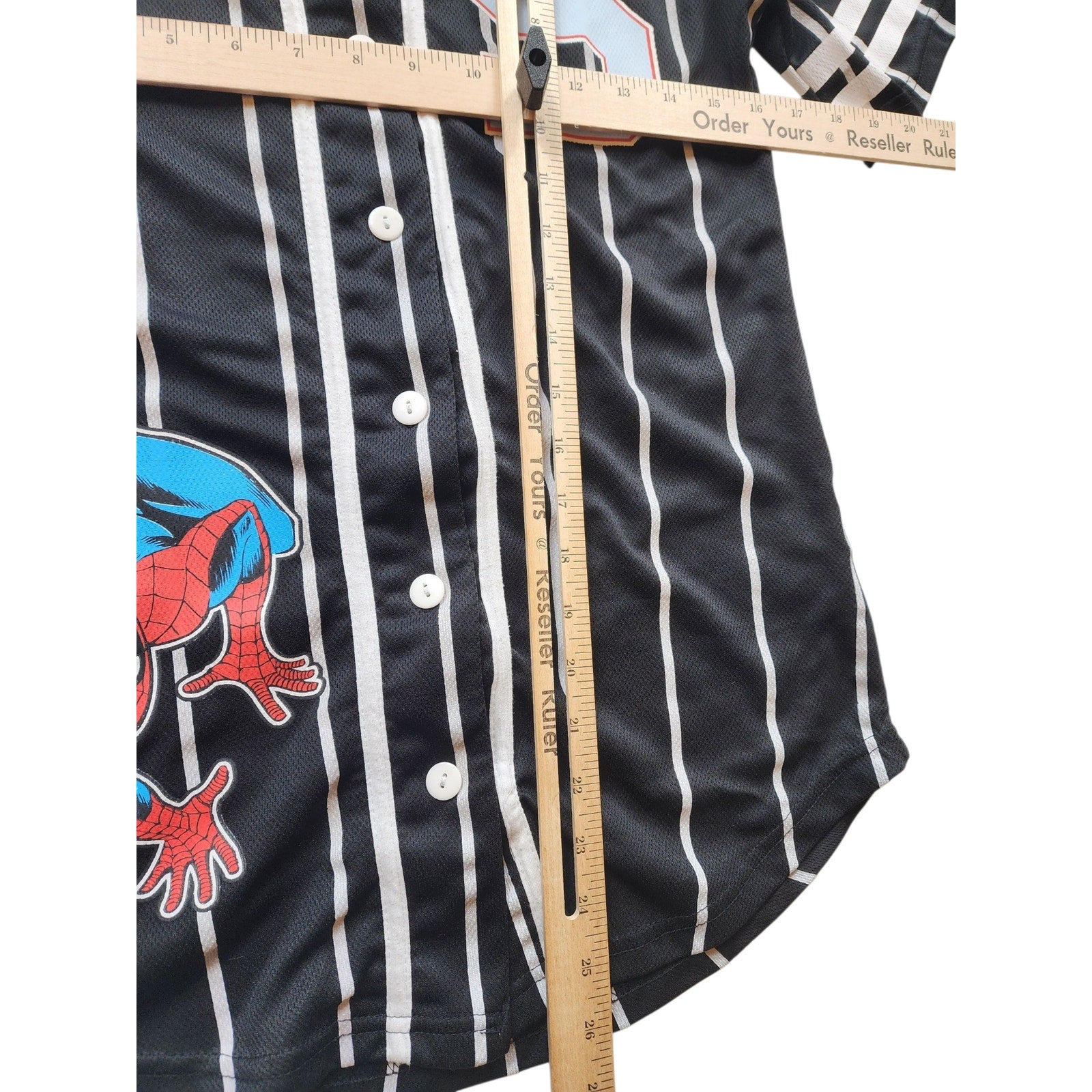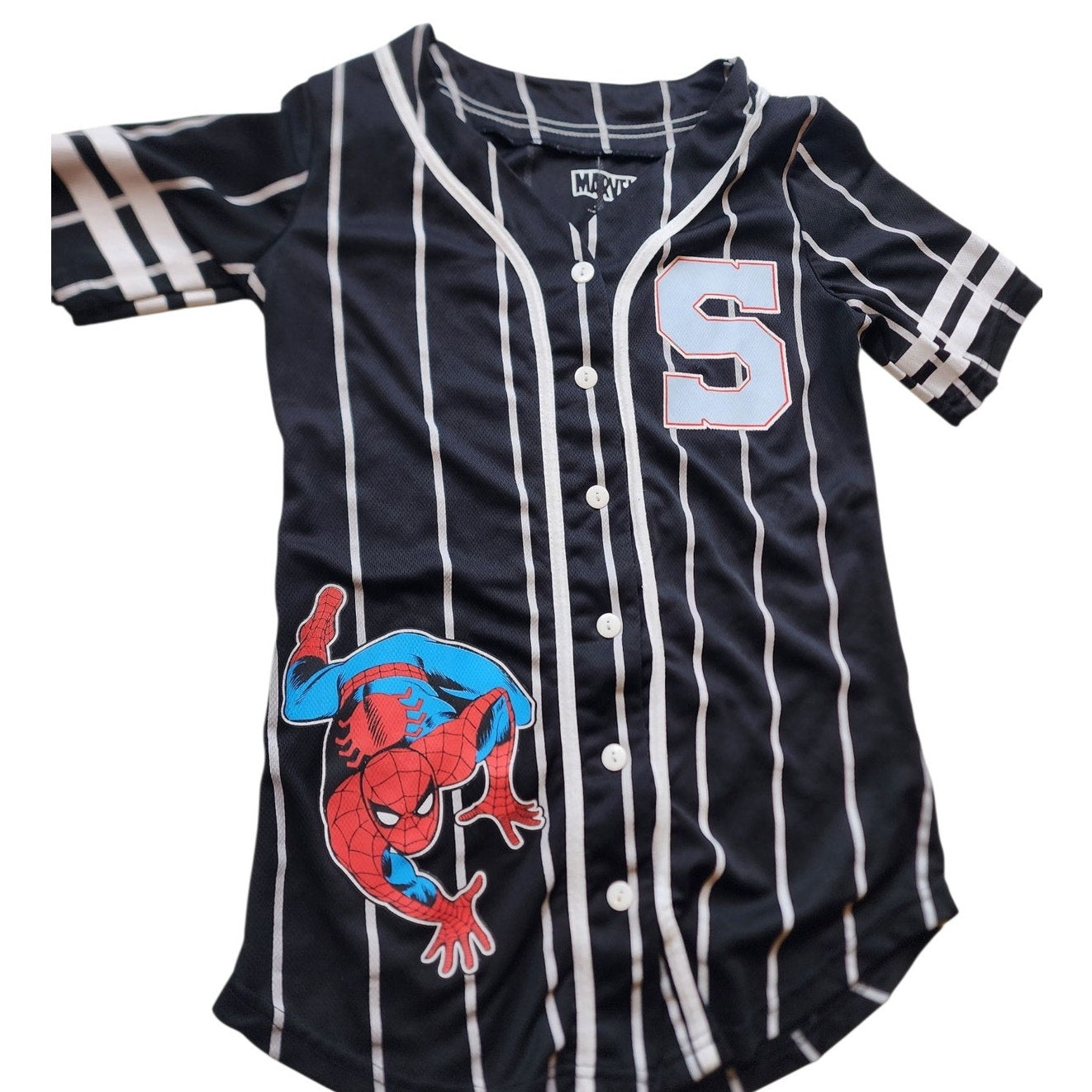 Marvel Spider Man Jersey Shirt Boys Medium Black Pinstripe Short Sleeve Superhero Graphic Tee Top