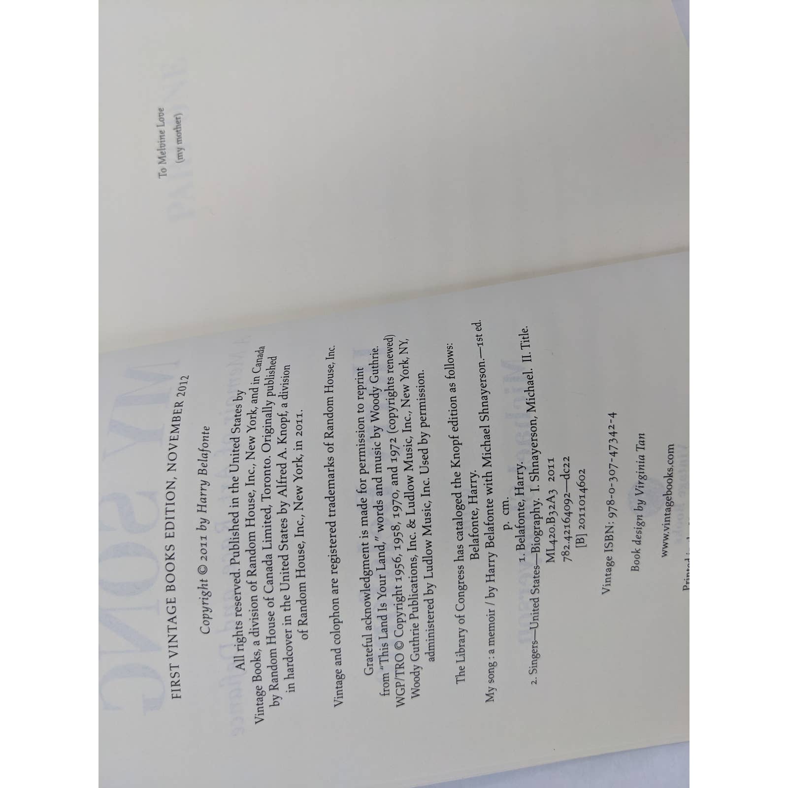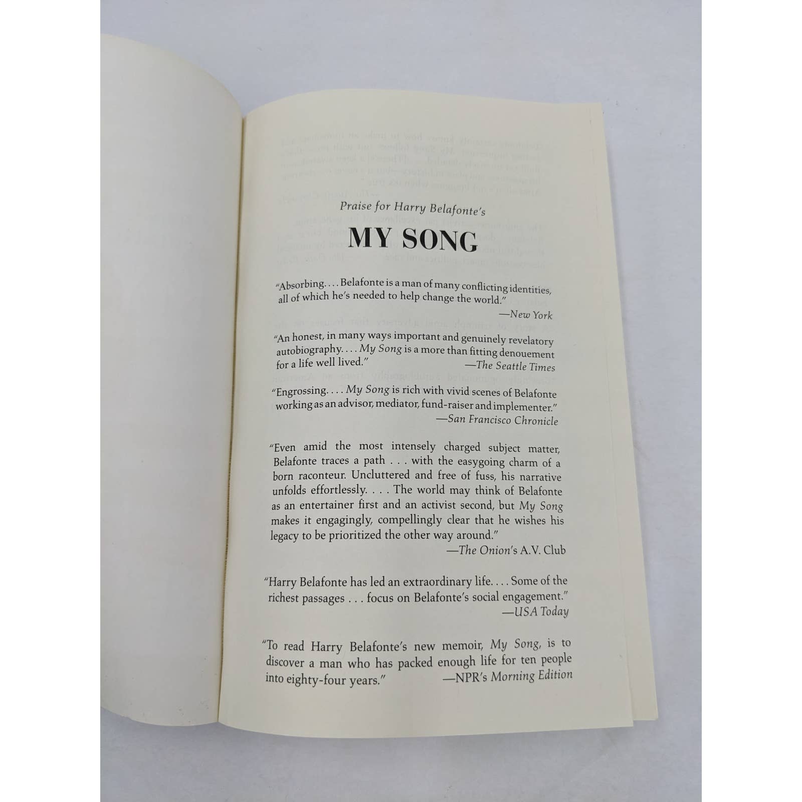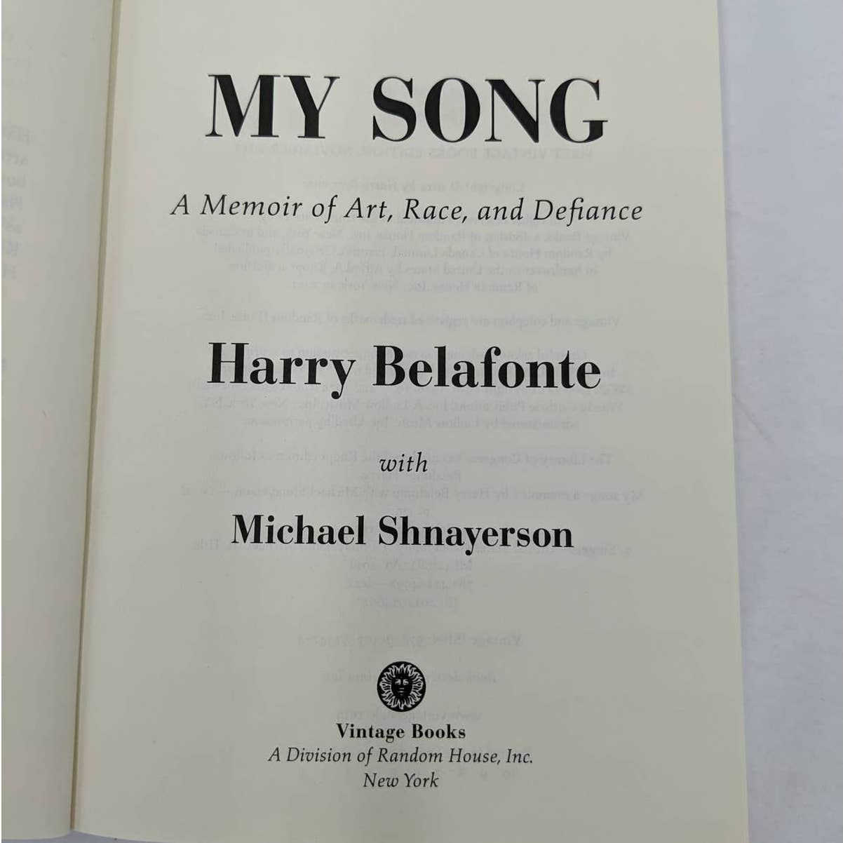 My Song: A Memoir of Art, Race, and Defiance is a 2011 memoir by Harry Belafonte. In the book, Belafonte recounts his life story, from his childhood in Harlem to his rise to fame as a singer, actor, and activist. He also writes about his involvement in the civil rights movement and his work to promote social justice.