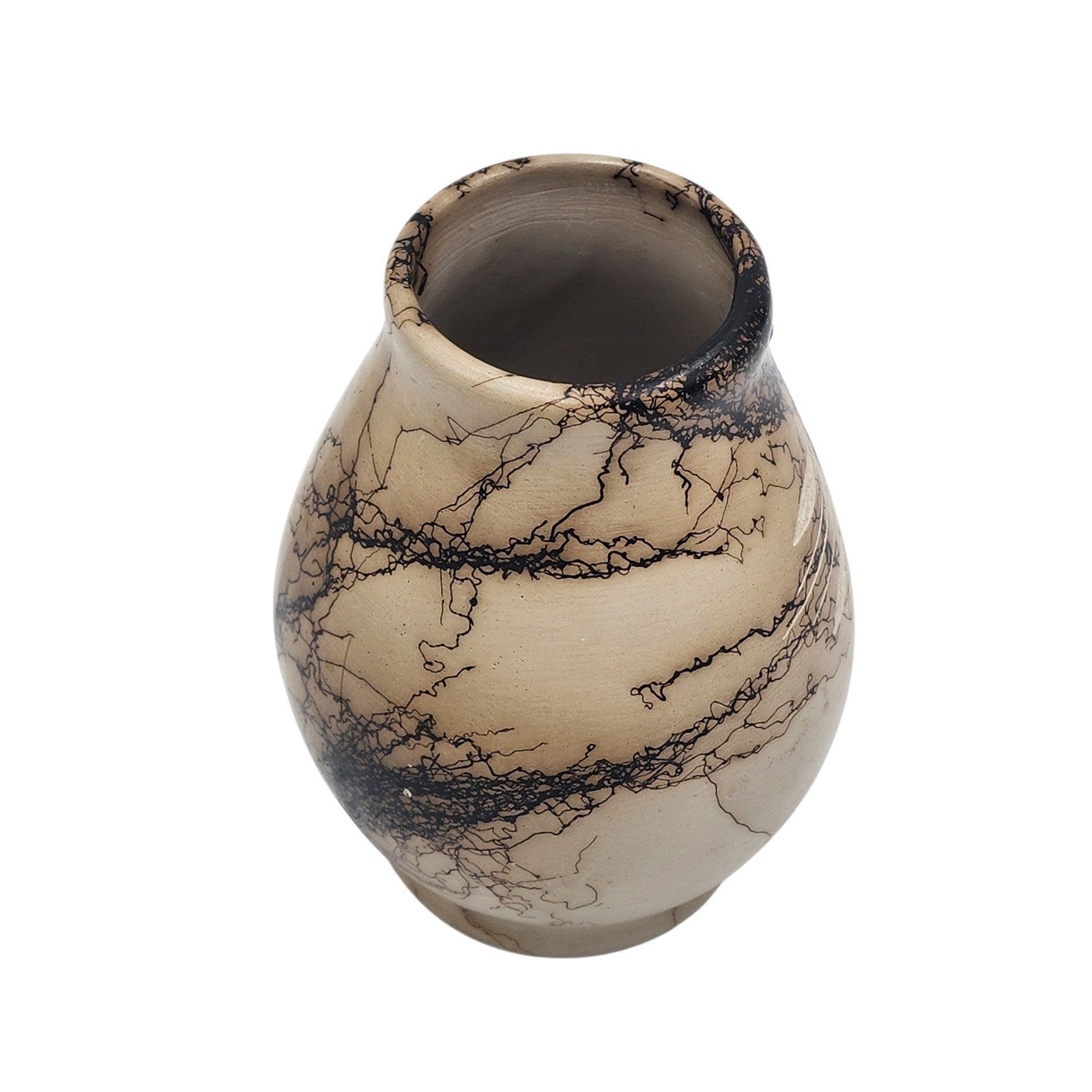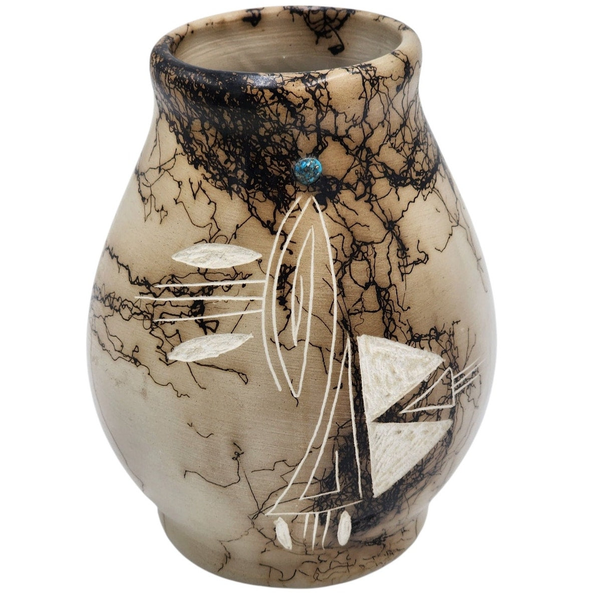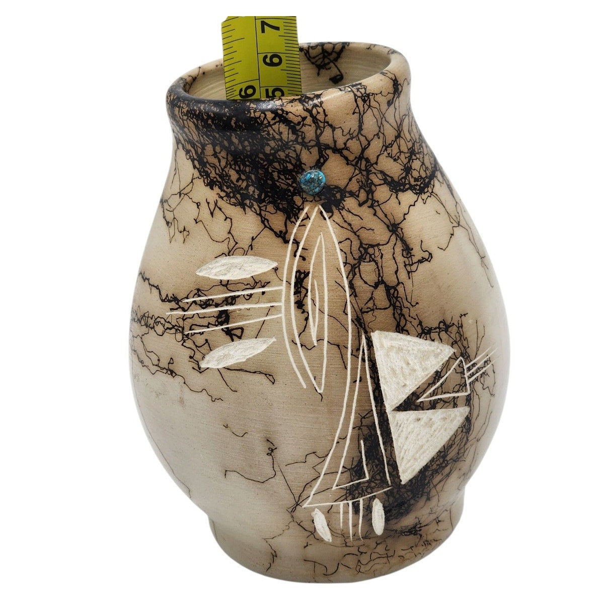 Native American Horsehair Pottery Vase Signed Southwest Tribal Art Etched Design Natural Tones Navajo Boho Turquoise Accents 6"