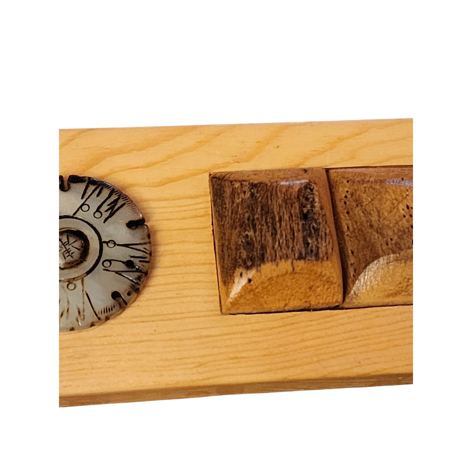 Native American Navajo Yei Wool Rug Handwoven Wall Hanging Wood Hanger Tribal Southwestern Style Textile Art Red Black Gray Geometric Concho Medallion Boho Vintage 31x15