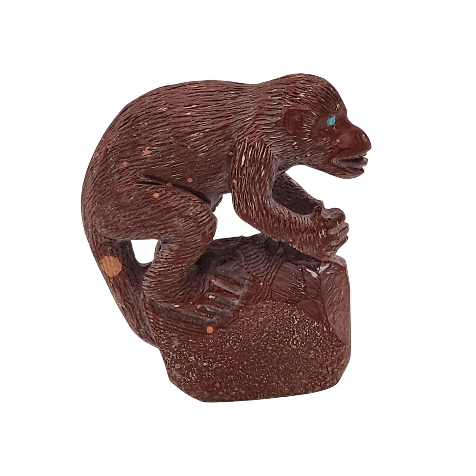 Native American Large Zuni Monkey Fetish Derrick Kaamasee Figurine Pipestone Carving Turquoise Inlay Animal Sculpture Tribal Art Signed 4"