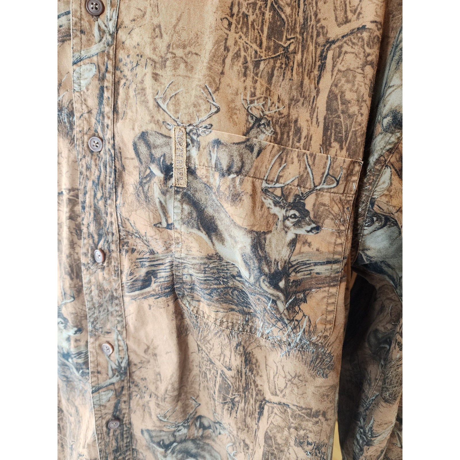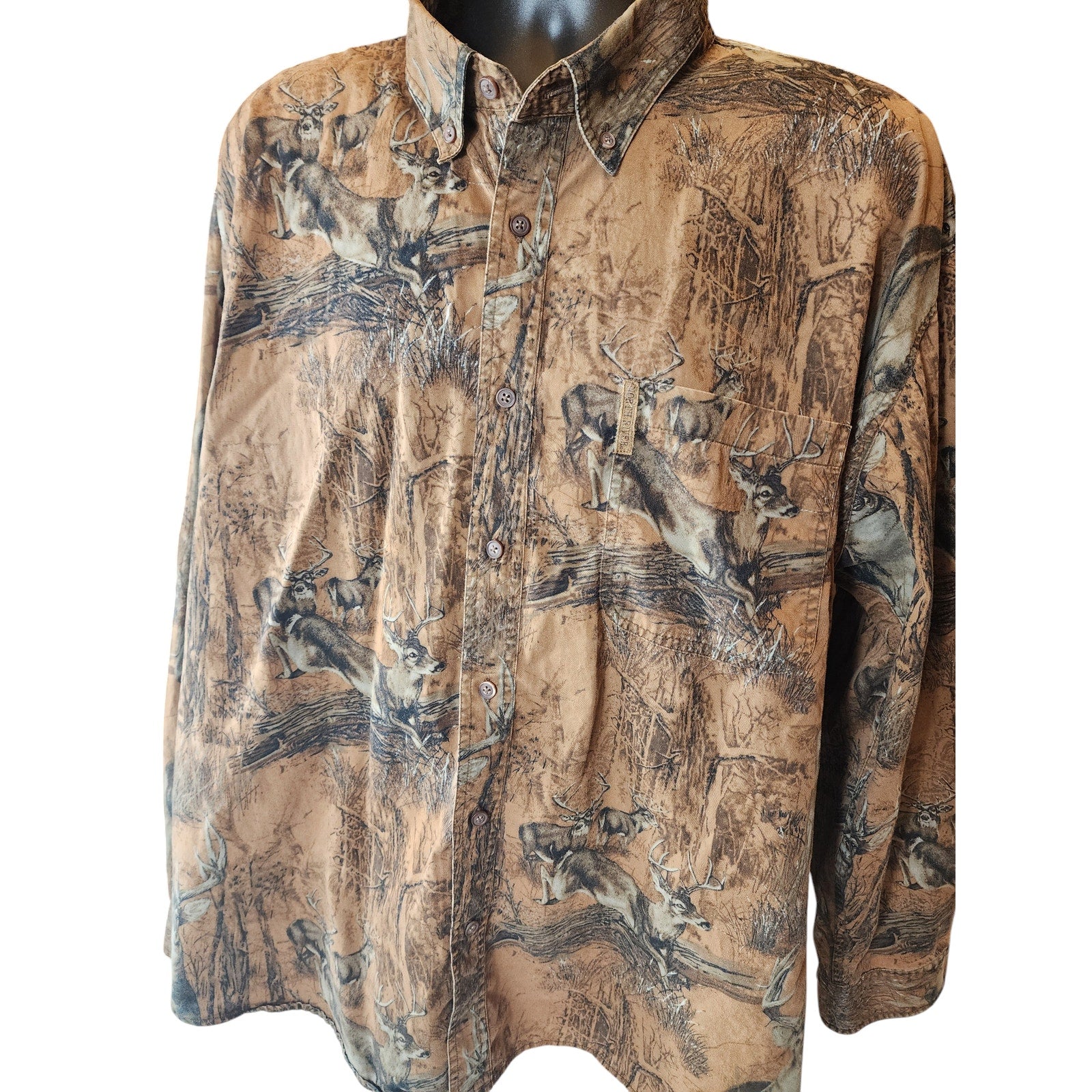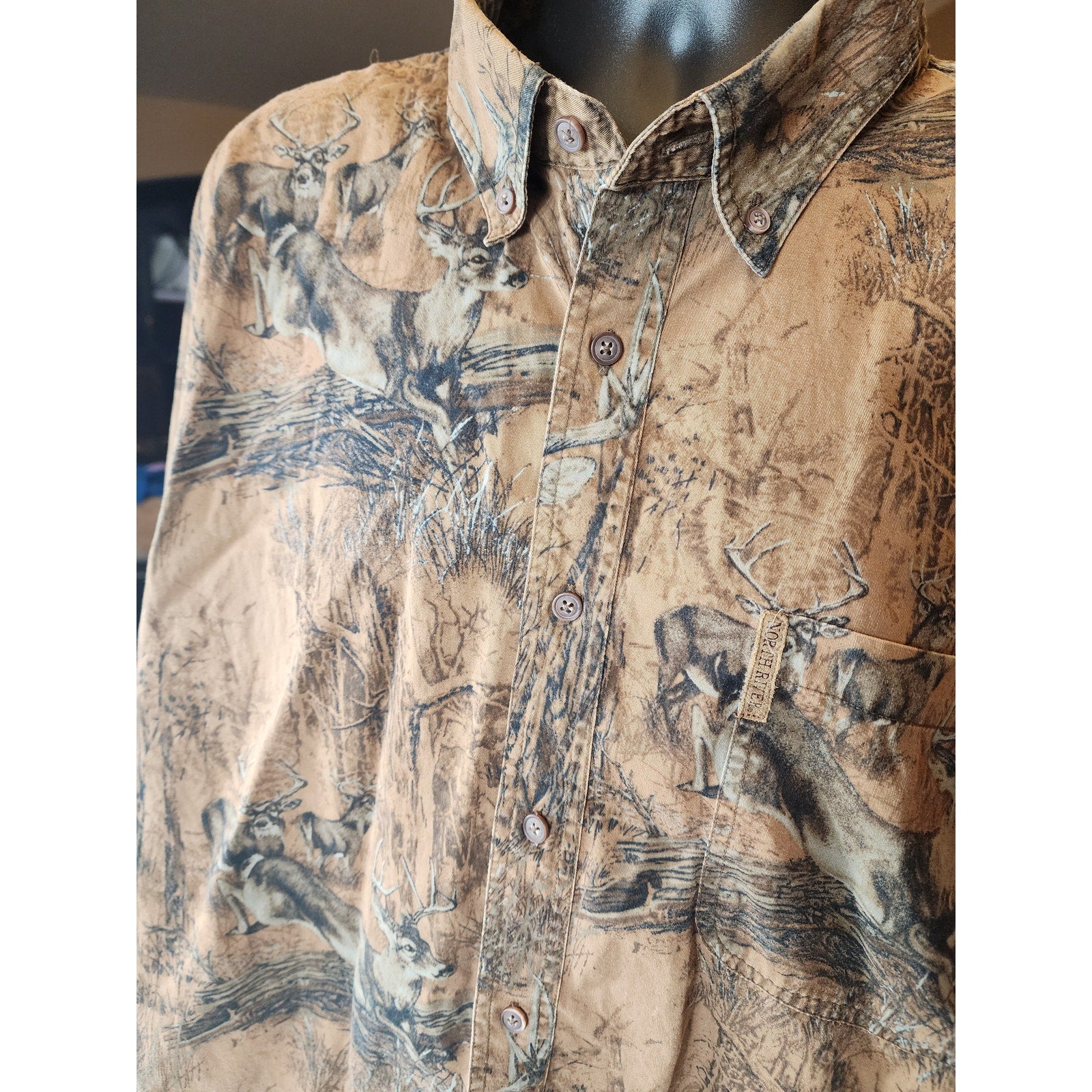 Noble River men's hunting shirt in size XXL, featuring an all-over deer camouflage print. This long-sleeve button-down shirt is crafted from 100% cotton, offering a soft and comfortable fit. Perfect for outdoor enthusiasts, hunters, or casual wear with a rugged style.