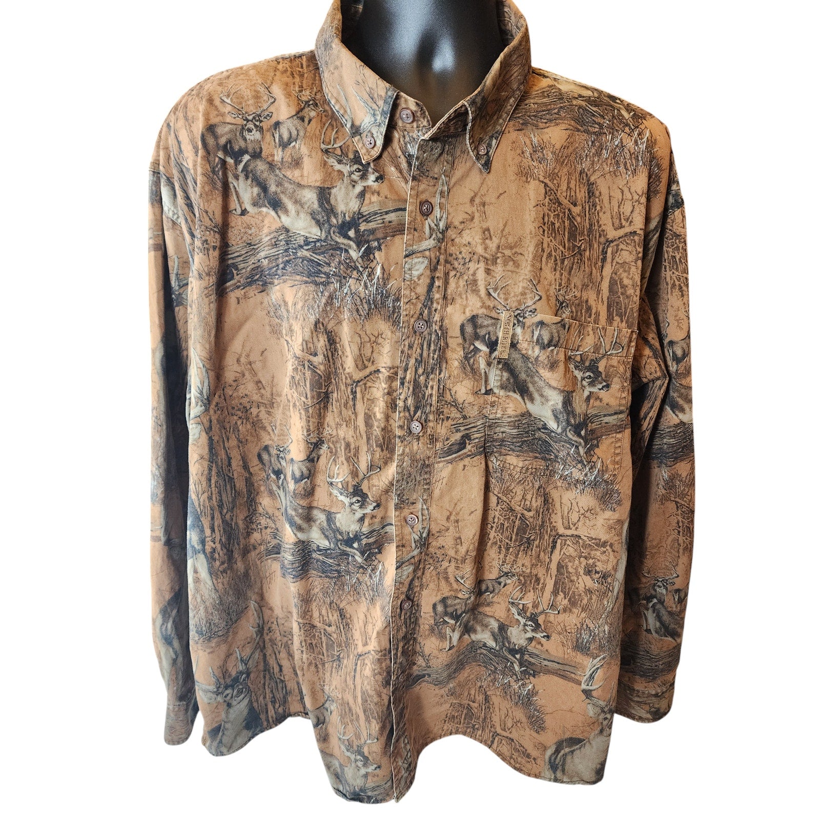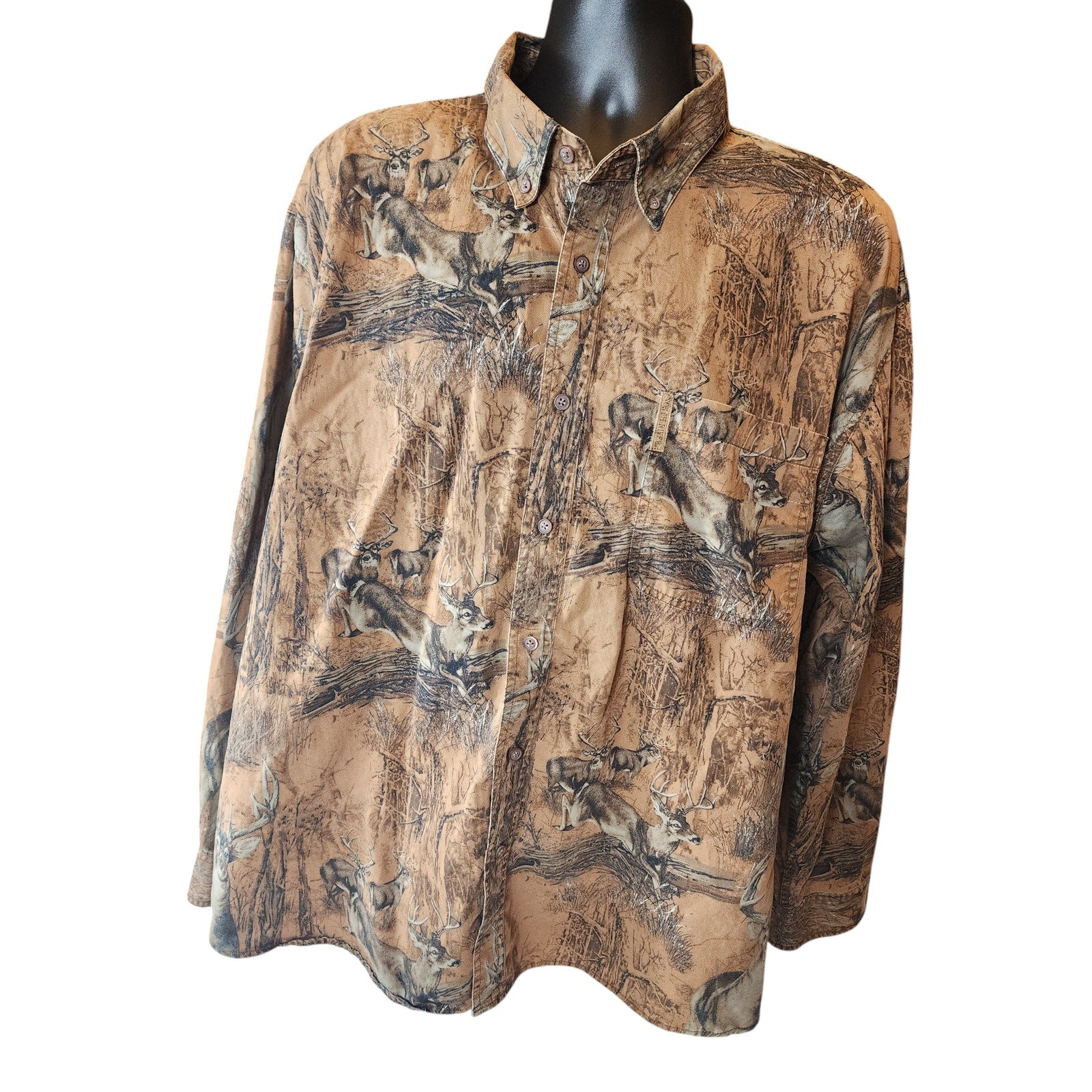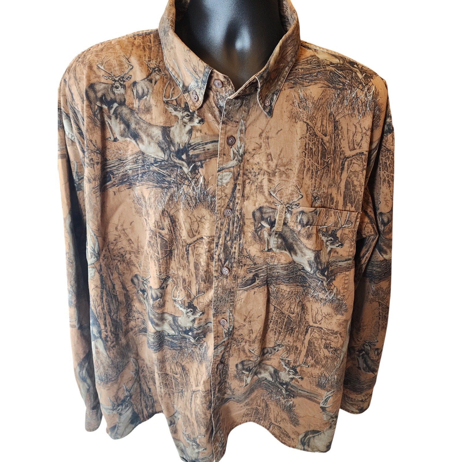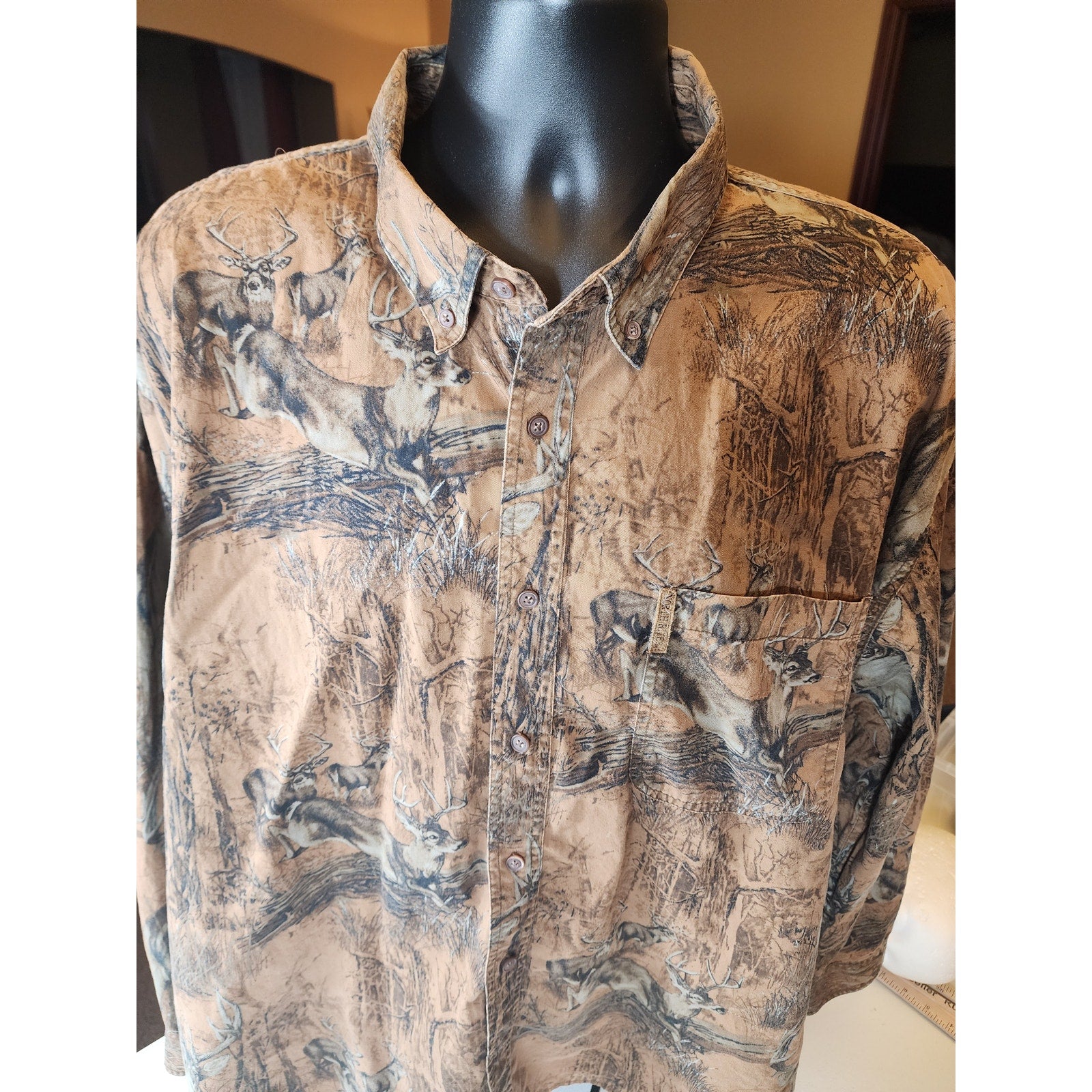 Noble River men's hunting shirt in size XXL, featuring an all-over deer camouflage print. This long-sleeve button-down shirt is crafted from 100% cotton, offering a soft and comfortable fit. Perfect for outdoor enthusiasts, hunters, or casual wear with a rugged style.
