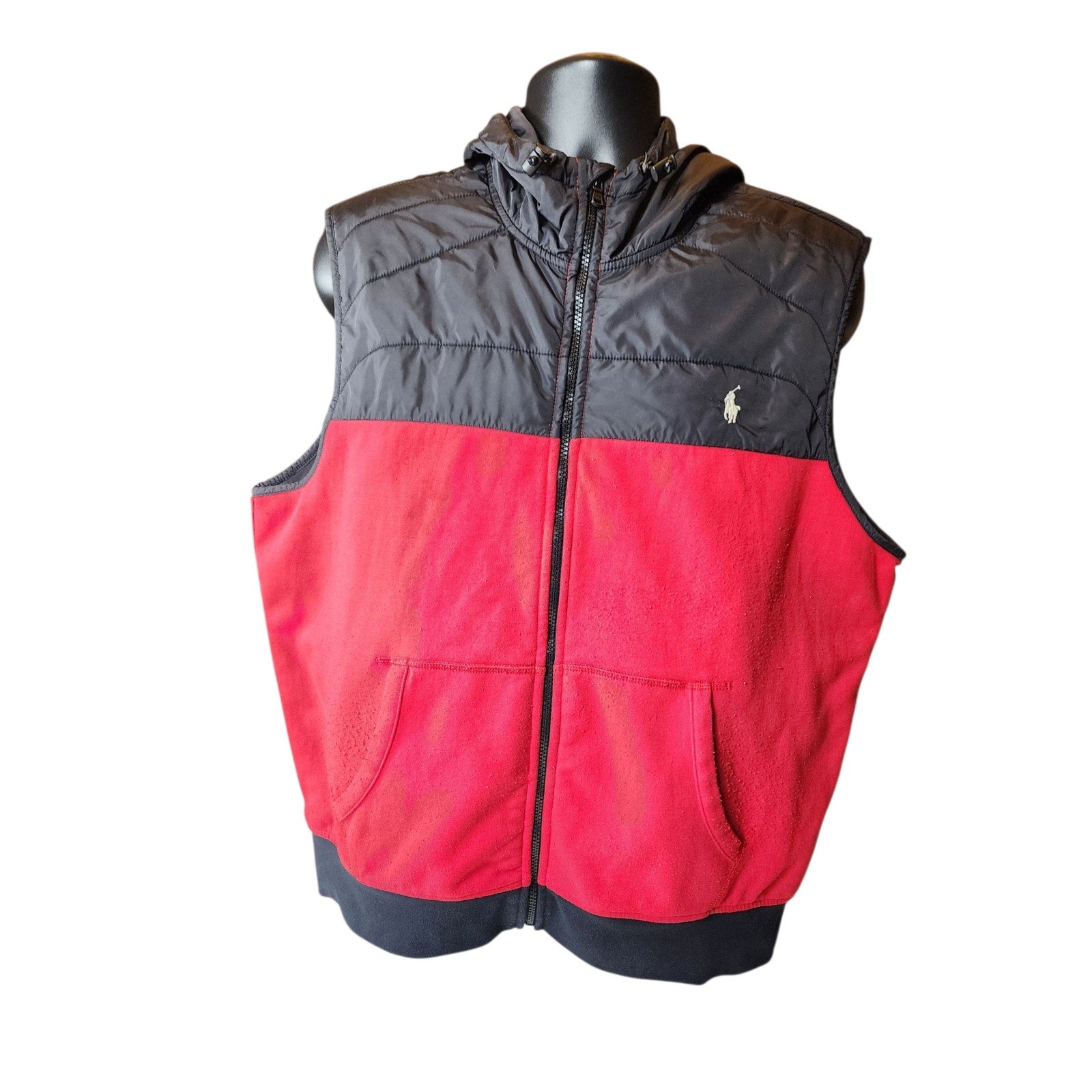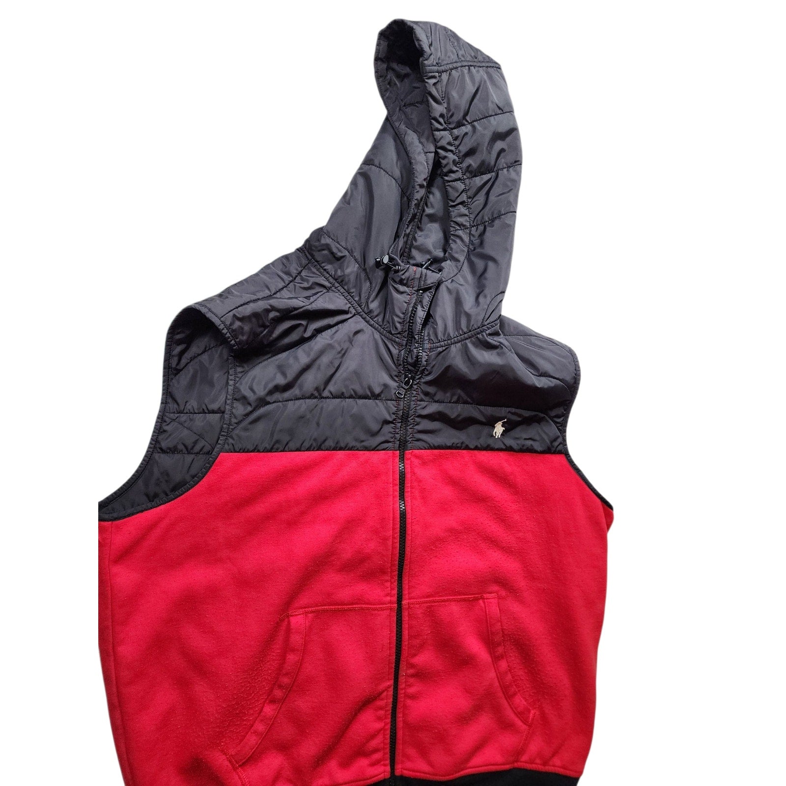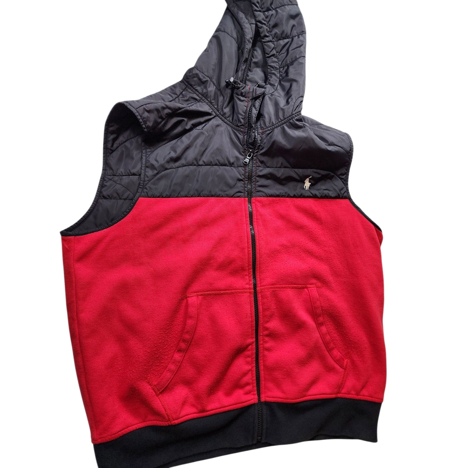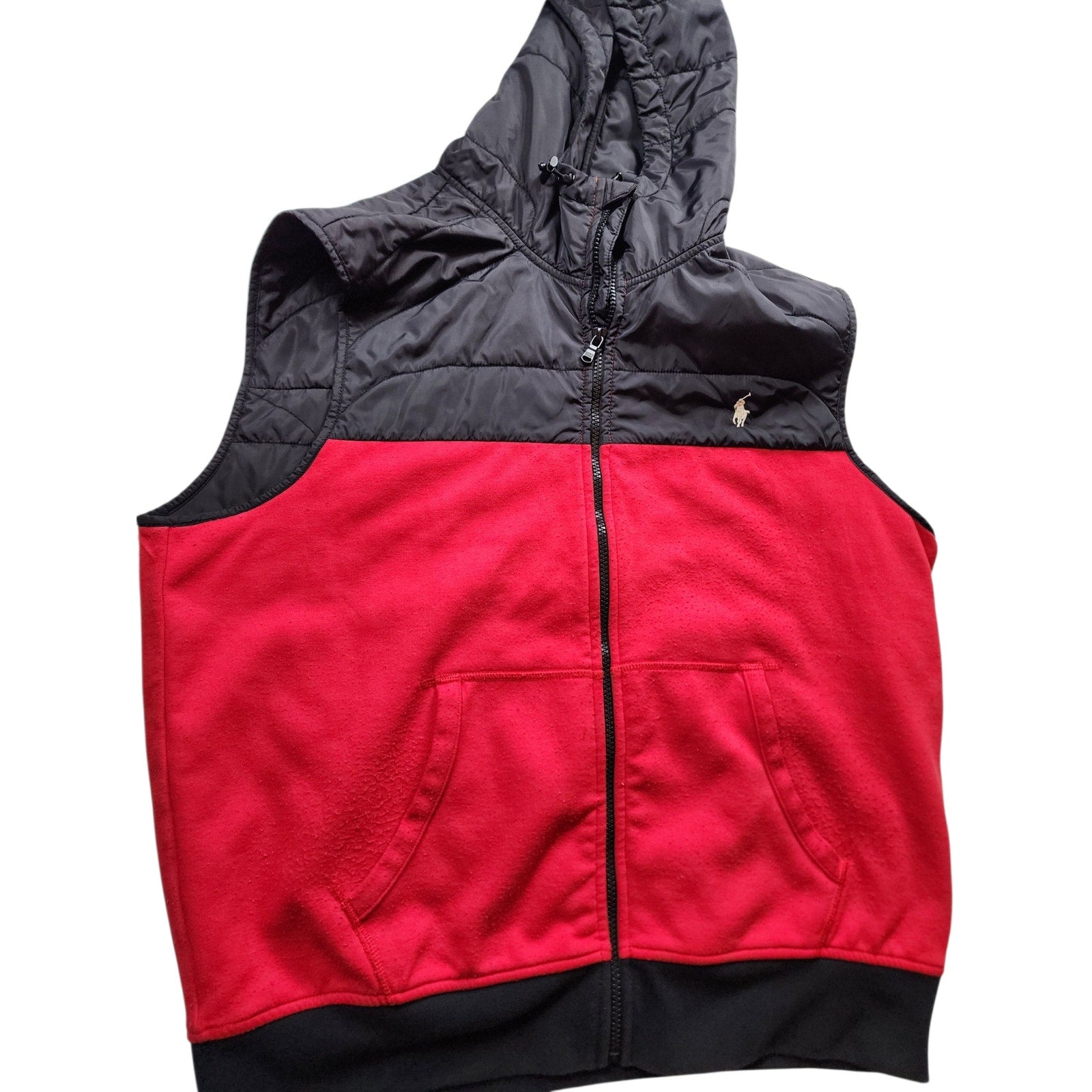 Polo Ralph Lauren Vest Mens XL Puffer Red Black Hooded Full Zip Front Pony Sleeveless Nylon Fleece Lined Zip Front Streetwear Casual Outerwear Gorpcore Sporty Gilet