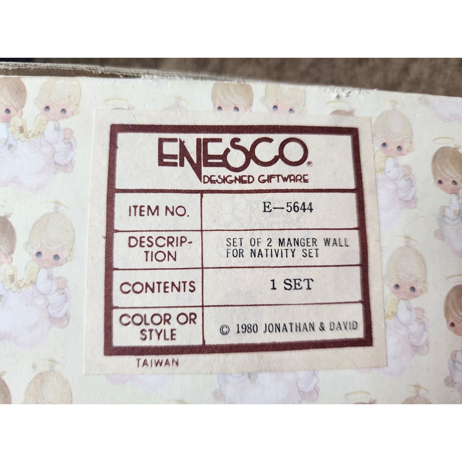 Two classic Enesco Precious Moments figurine pieces by Jonathan & David — “They Followed The Star” (E-5641) and “Set of 2 Manger Wall for Nativity Set” (E-5644).