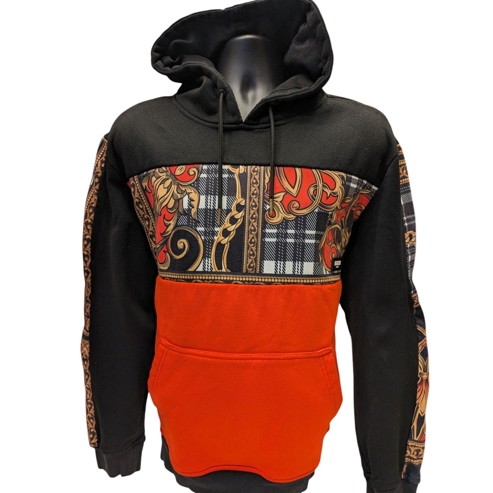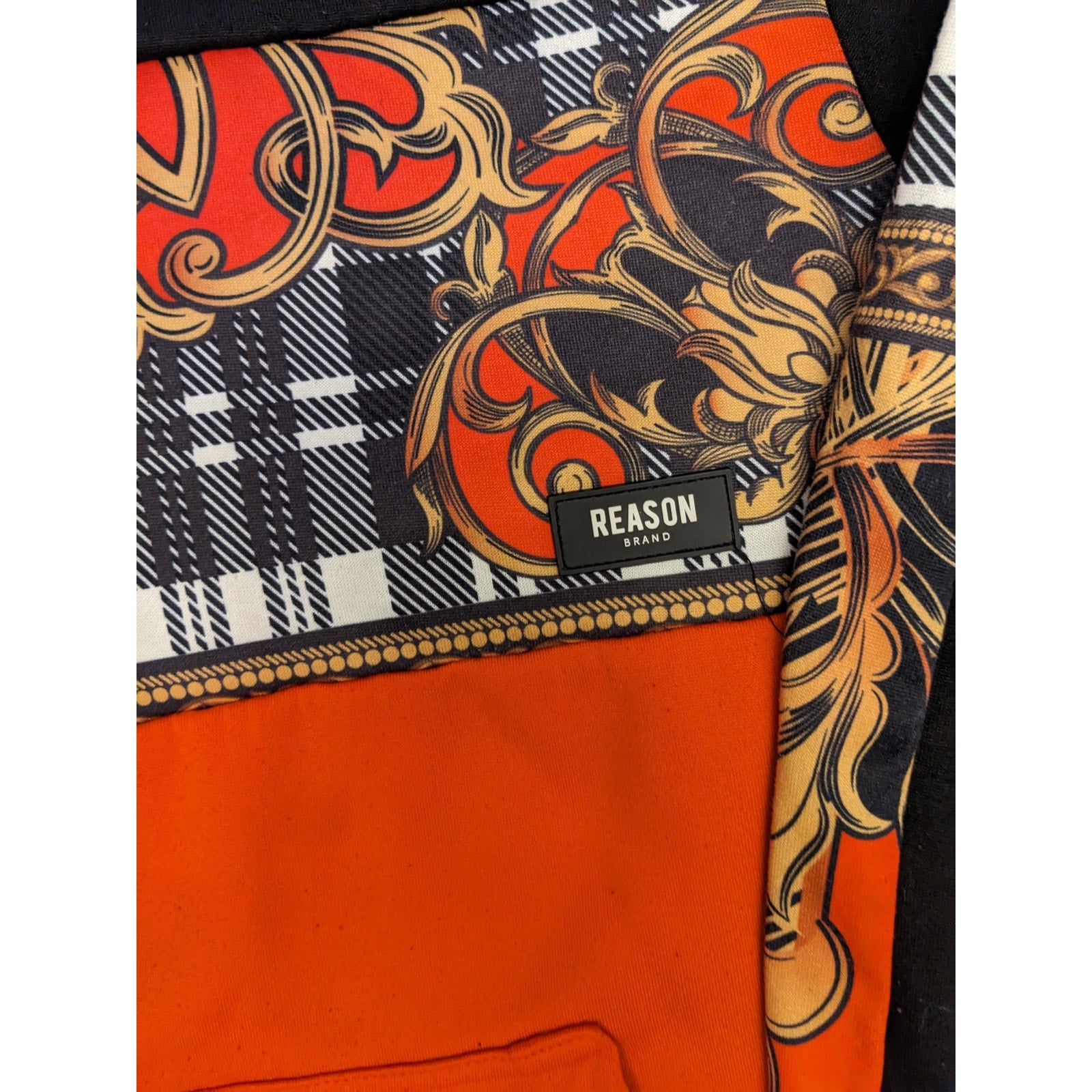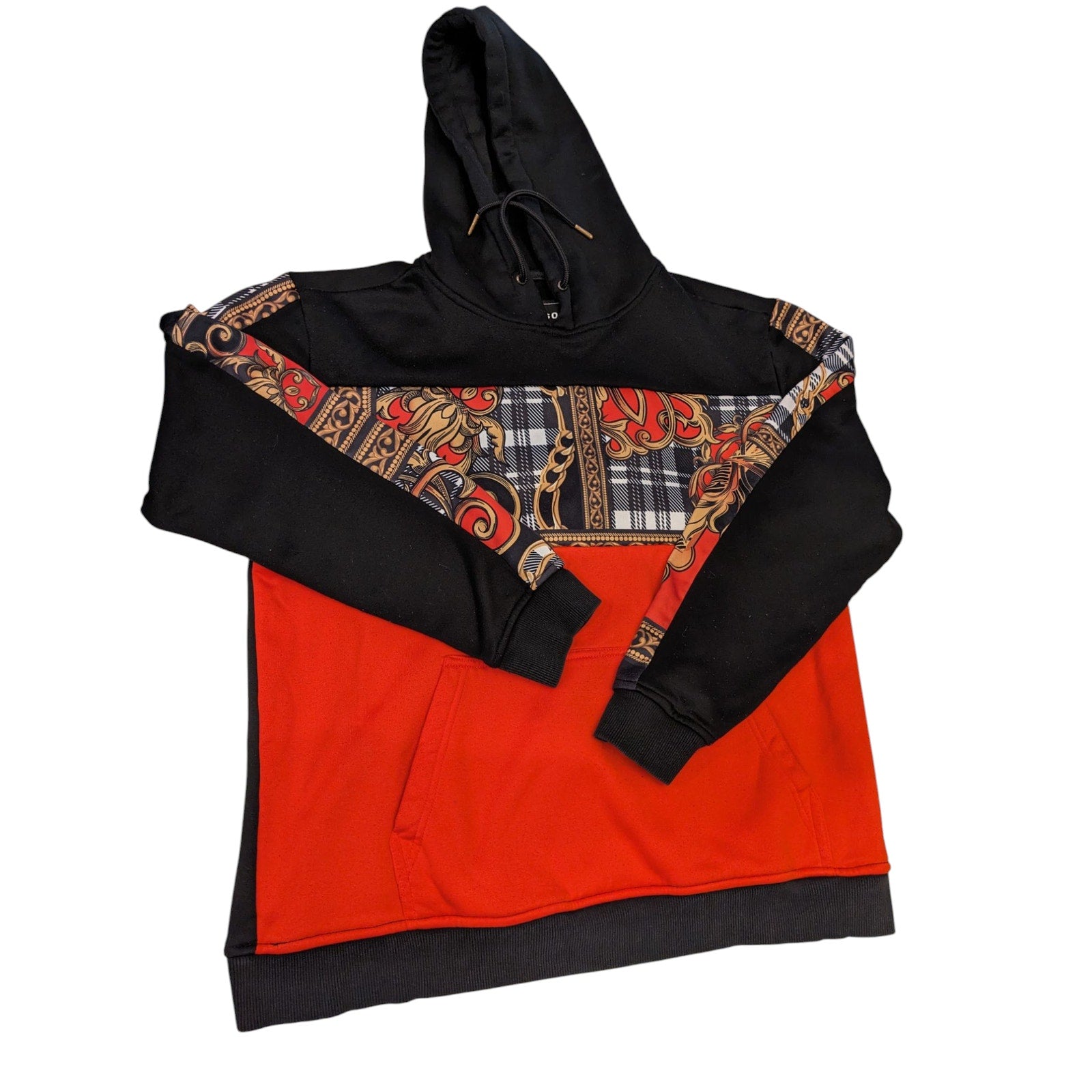 Step up your streetwear game with this Reason Brand hoodie, designed in New York City. This men’s size large pullover hoodie features an eye-catching baroque and plaid print in black, red, and gold, making it a bold statement piece. With a kangaroo pocket, adjustable drawstring hood, and ribbed cuffs and hem, this hoodie is as functional as it is stylish.