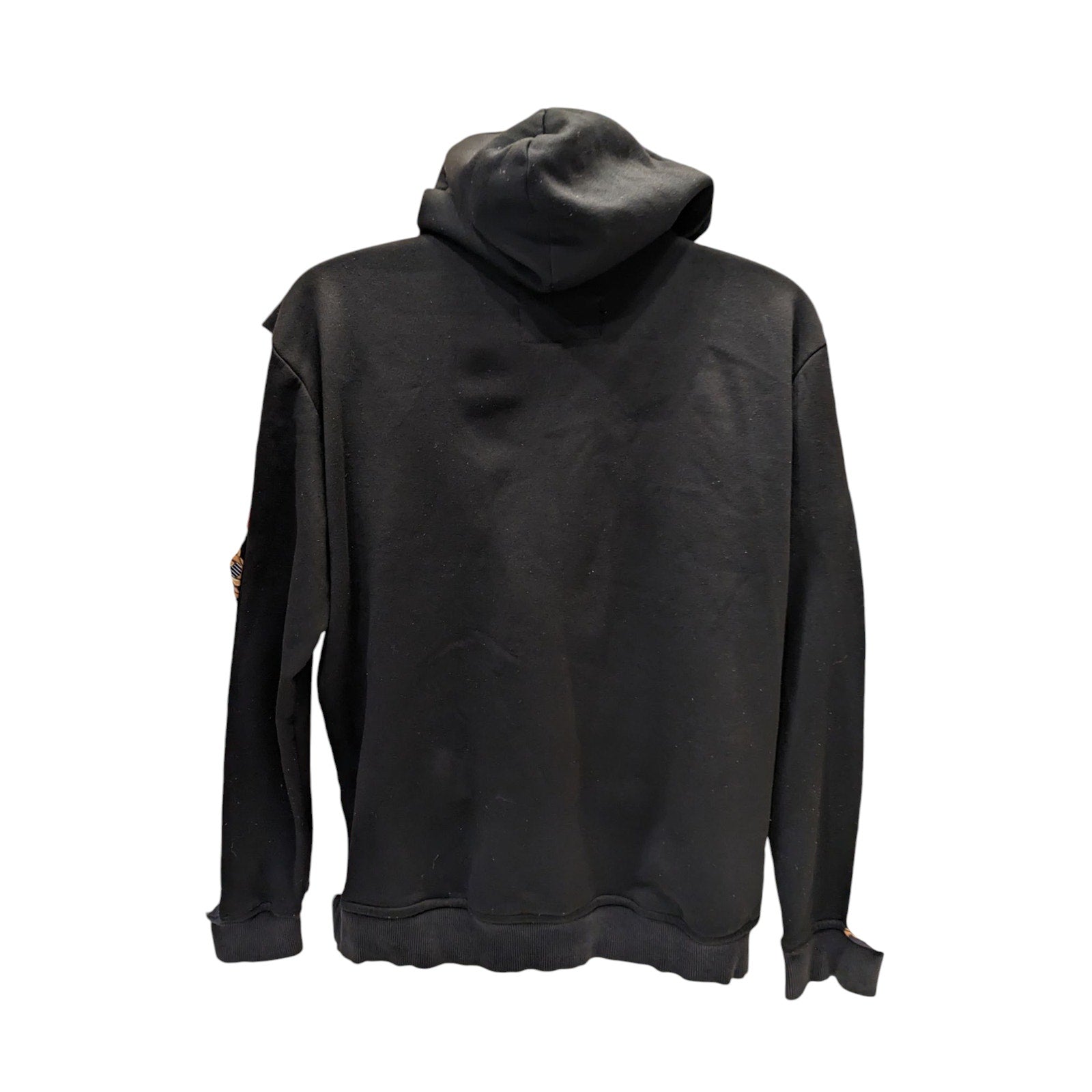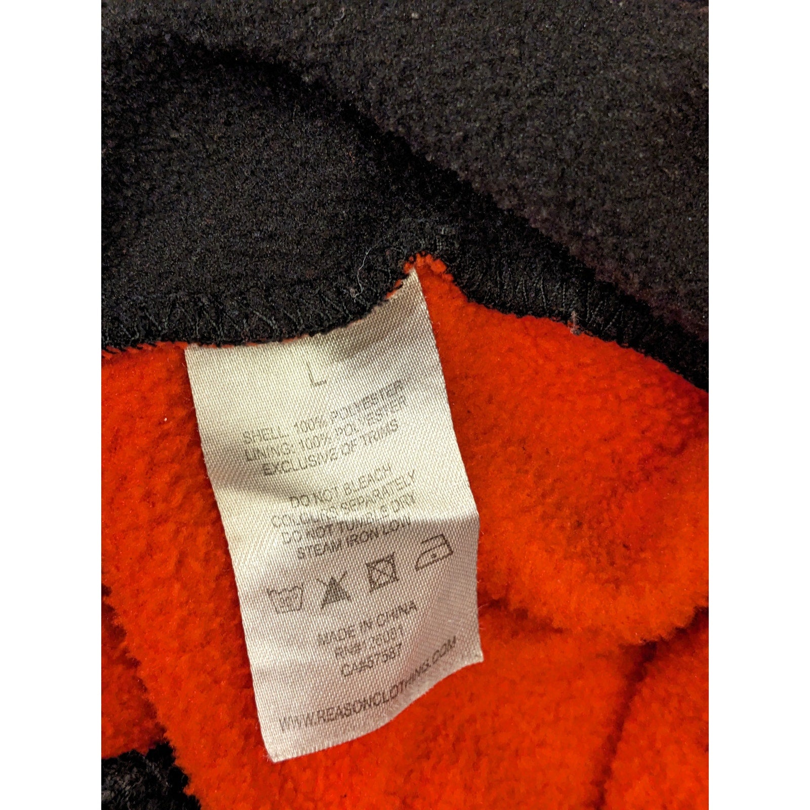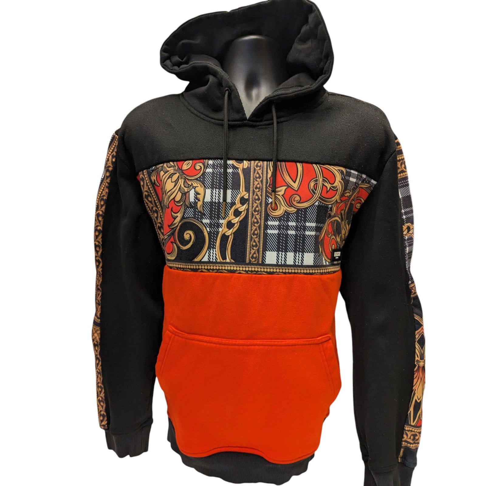 Step up your streetwear game with this Reason Brand hoodie, designed in New York City. This men’s size large pullover hoodie features an eye-catching baroque and plaid print in black, red, and gold, making it a bold statement piece. With a kangaroo pocket, adjustable drawstring hood, and ribbed cuffs and hem, this hoodie is as functional as it is stylish.