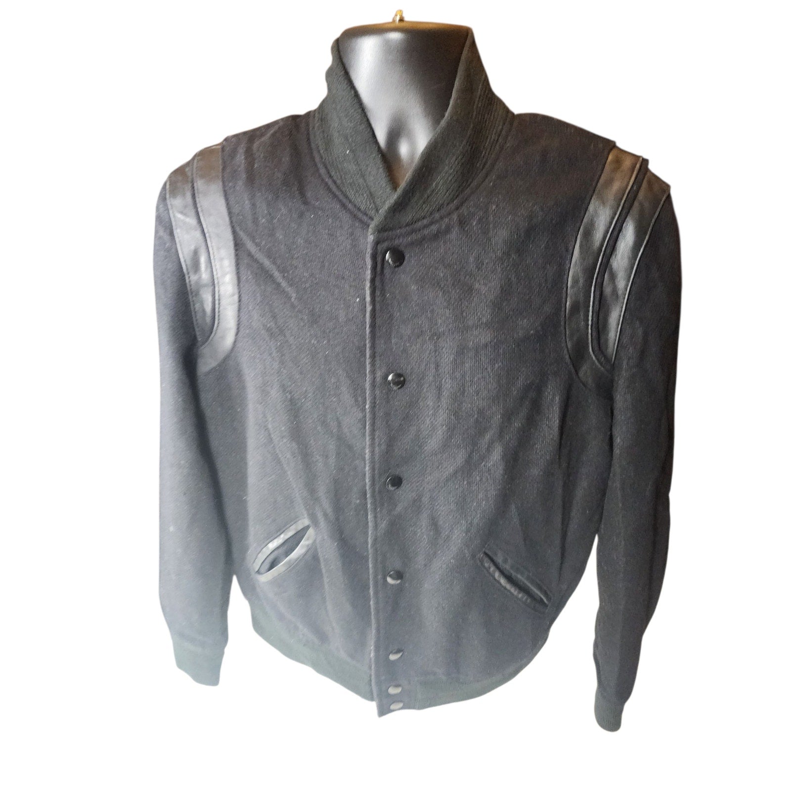 Saint Laurent Teddy Jacket Mens 52 Large Black Wool Bomber Leather Shoulder Trim Ribbed Collar Made in Italy Outerwear Paris Snap