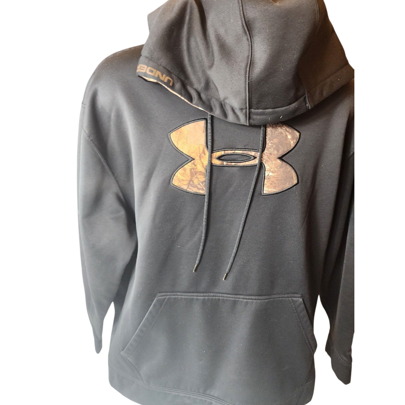 Under Armour Hoodie Mens XL Black Camo Logo Loose Fit Storm Pullover Sweatshirt Hunting Outdoor Activewear Kangaroo Pocket Gorpcore