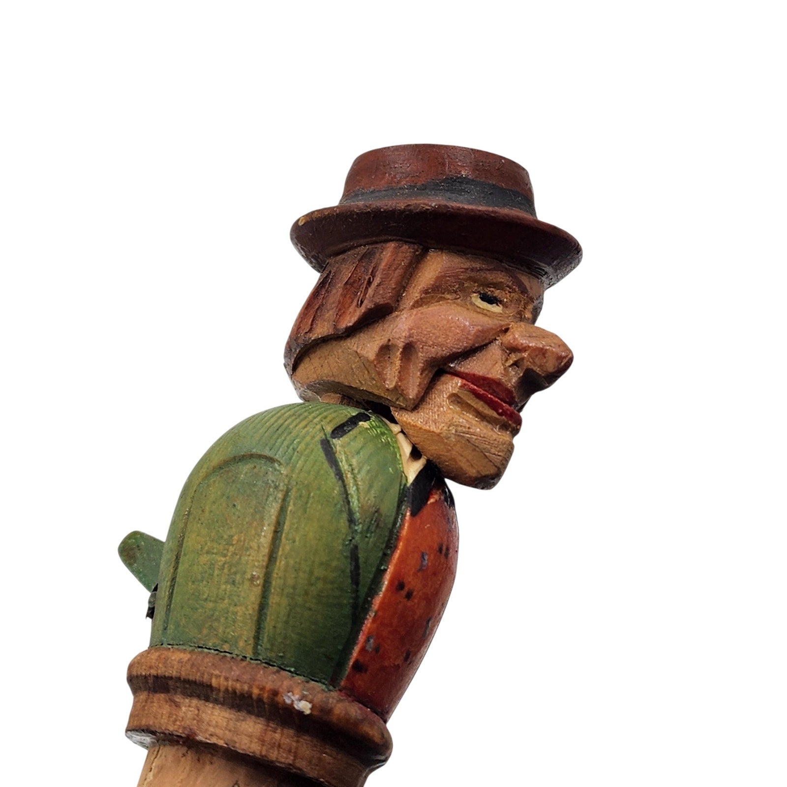 Vintage ANRI Italian Hand Carved Wooden Bottle Stopper Man Movable Folk Art Barware Caricature